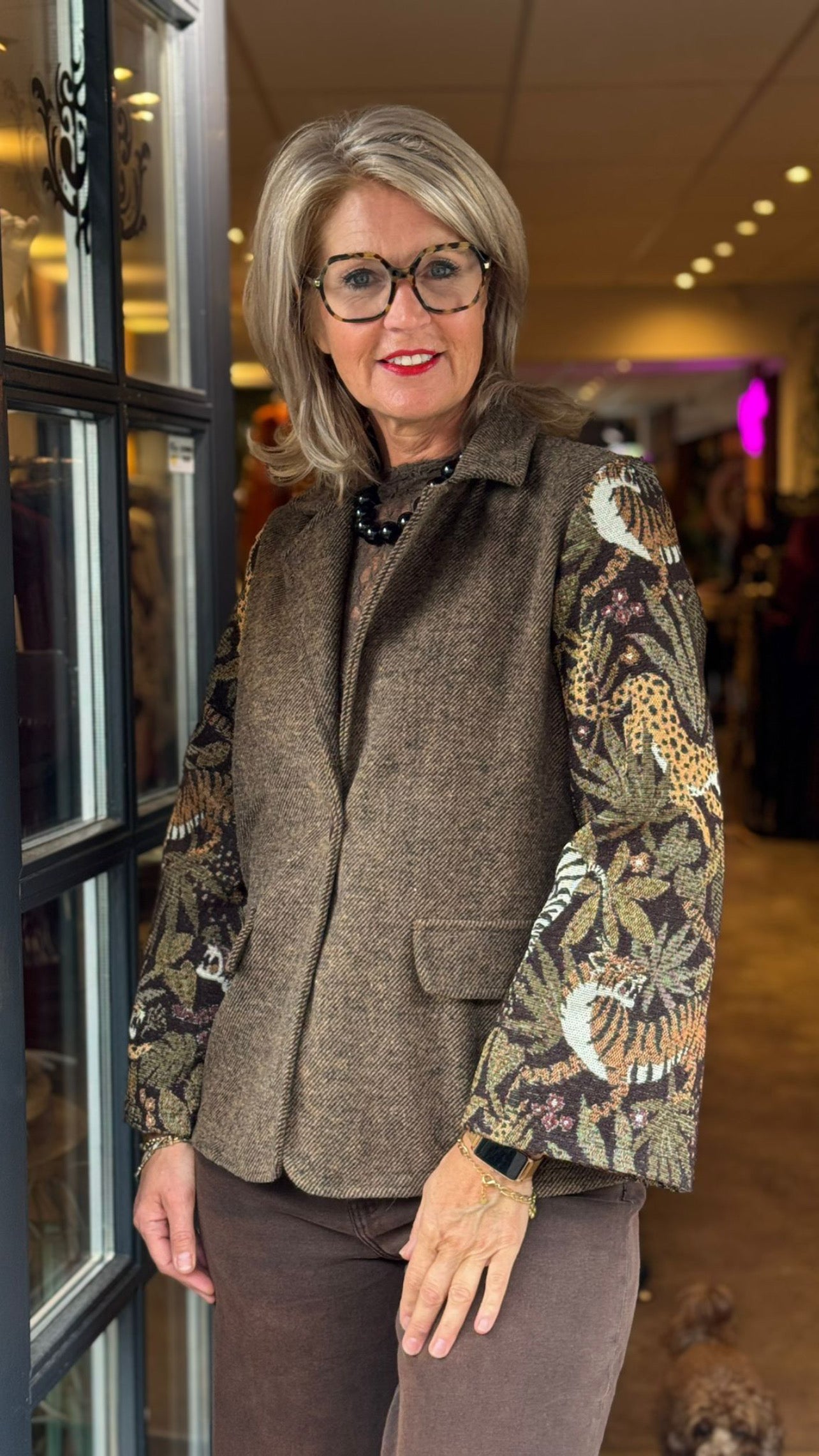 De rijke bruine tinten en de opvallende, gebloemde mouwen geven elke outfit een elegante en speelse twist.
