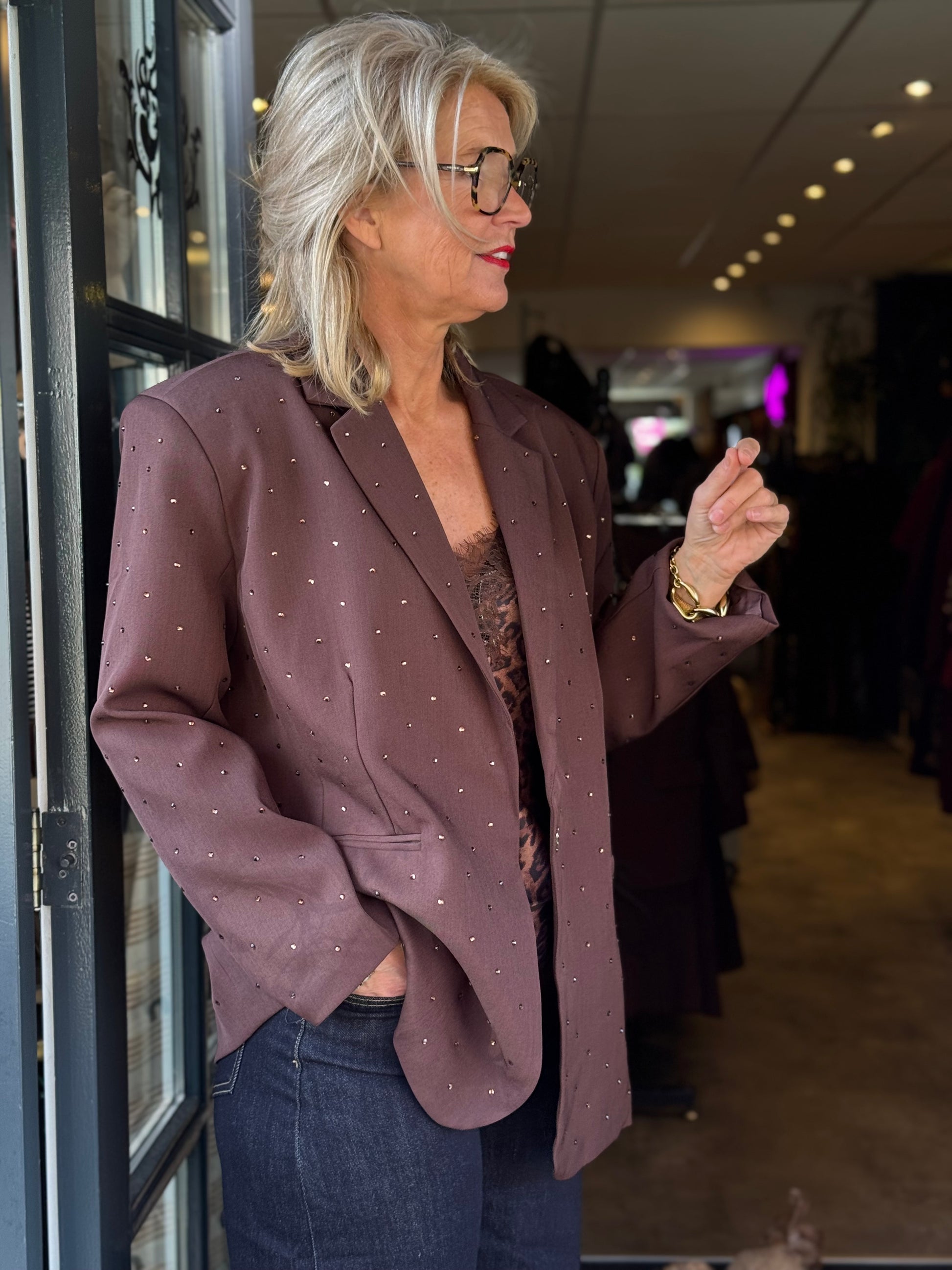 Trendy oversized blazer met een chique twist — subtiel versierd met bruine steentjes die elke look net dat beetje extra geven.