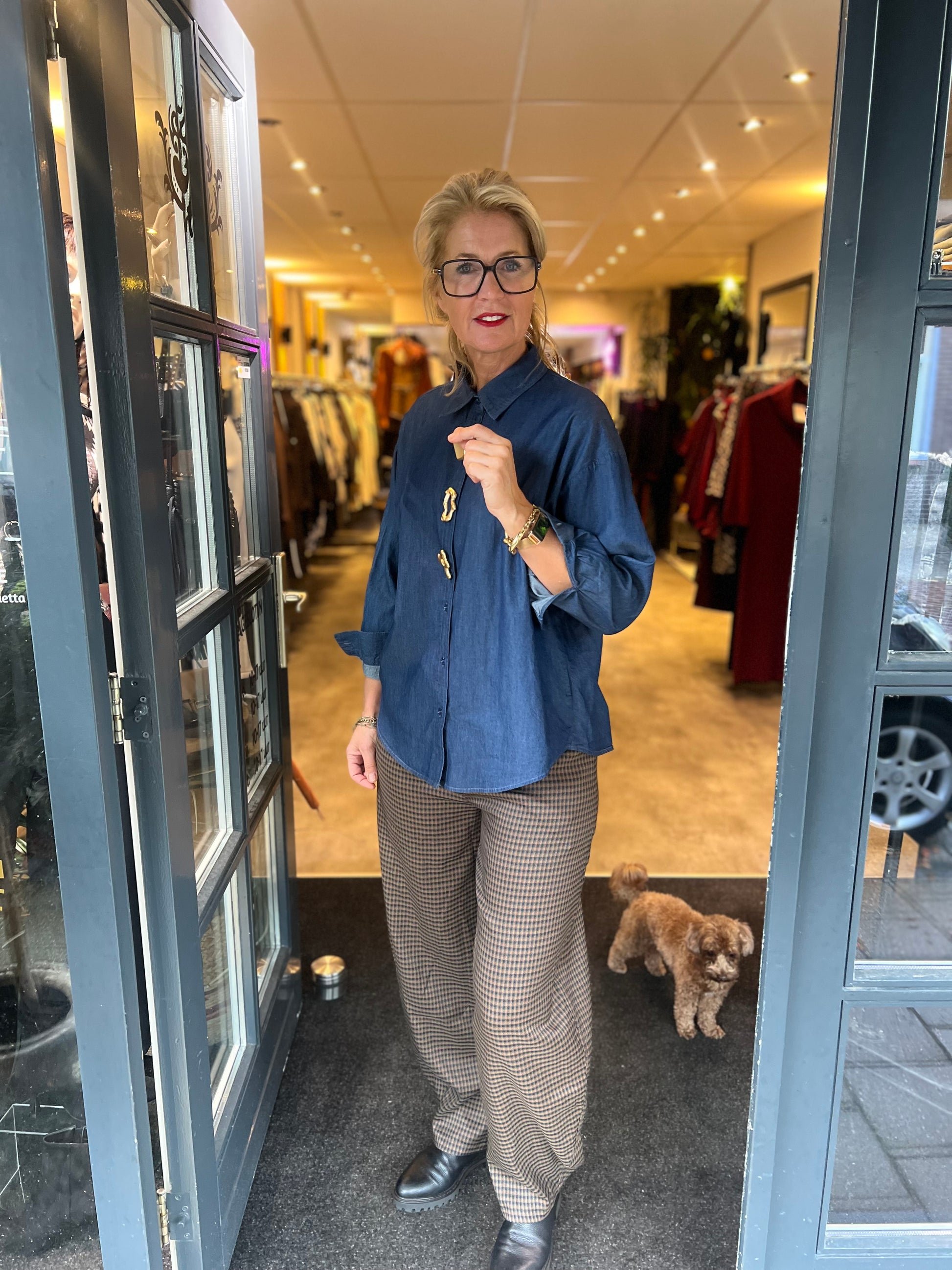 Deze jeans blouse combineert stoer denim met een vleugje glamour.