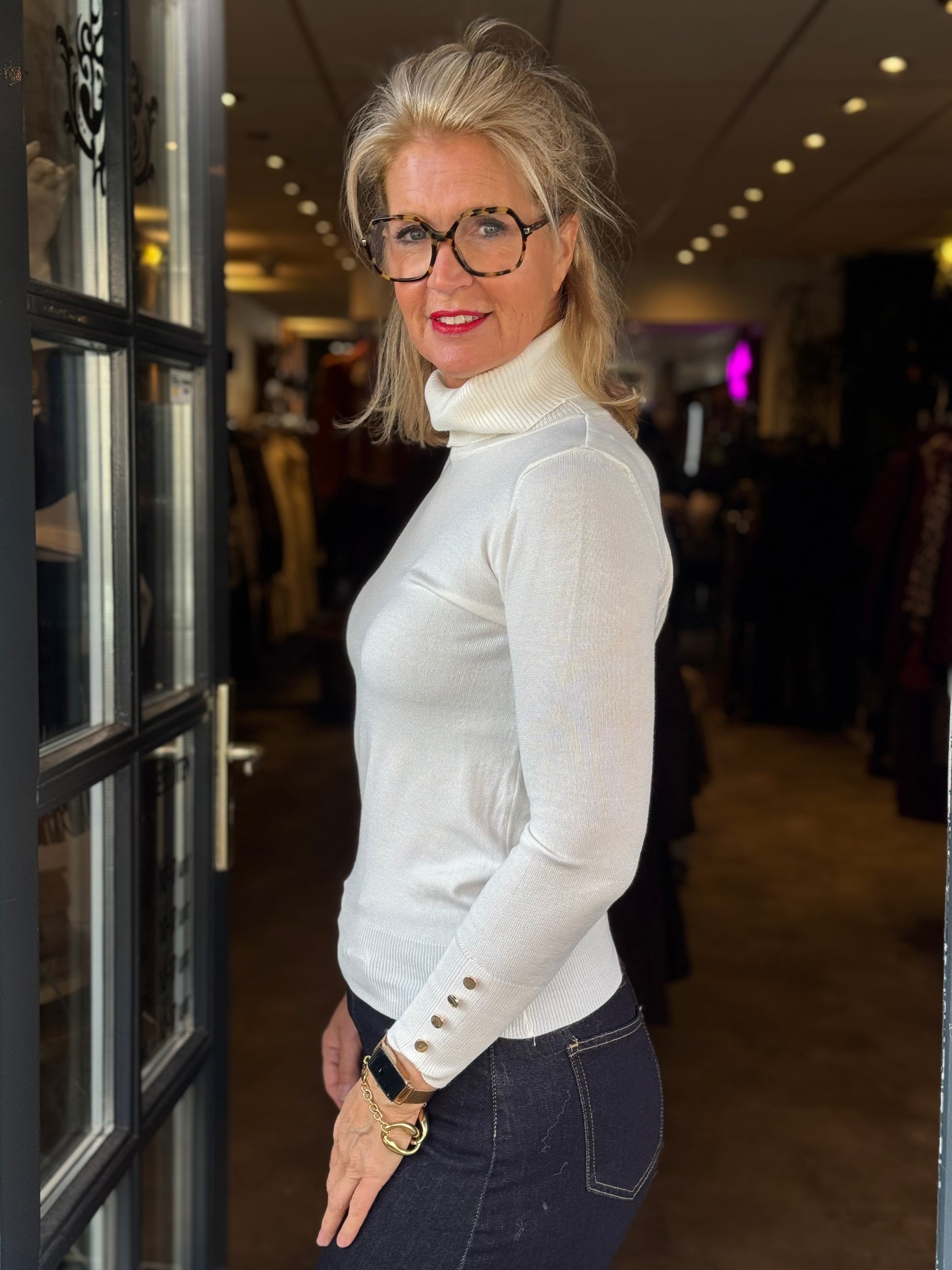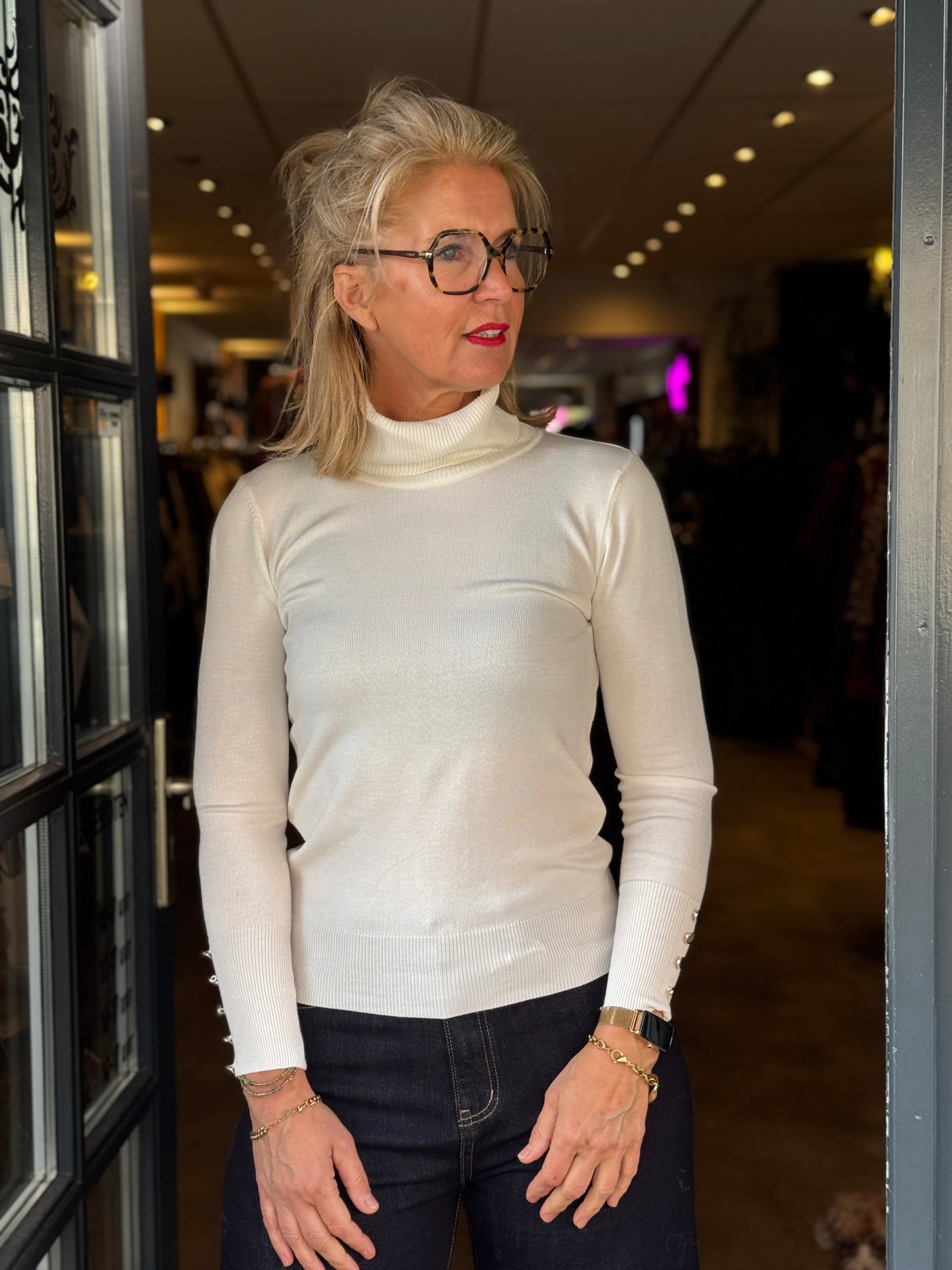 De elegante knoopjes aan de mouw geven deze coltrui net dat beetje extra.