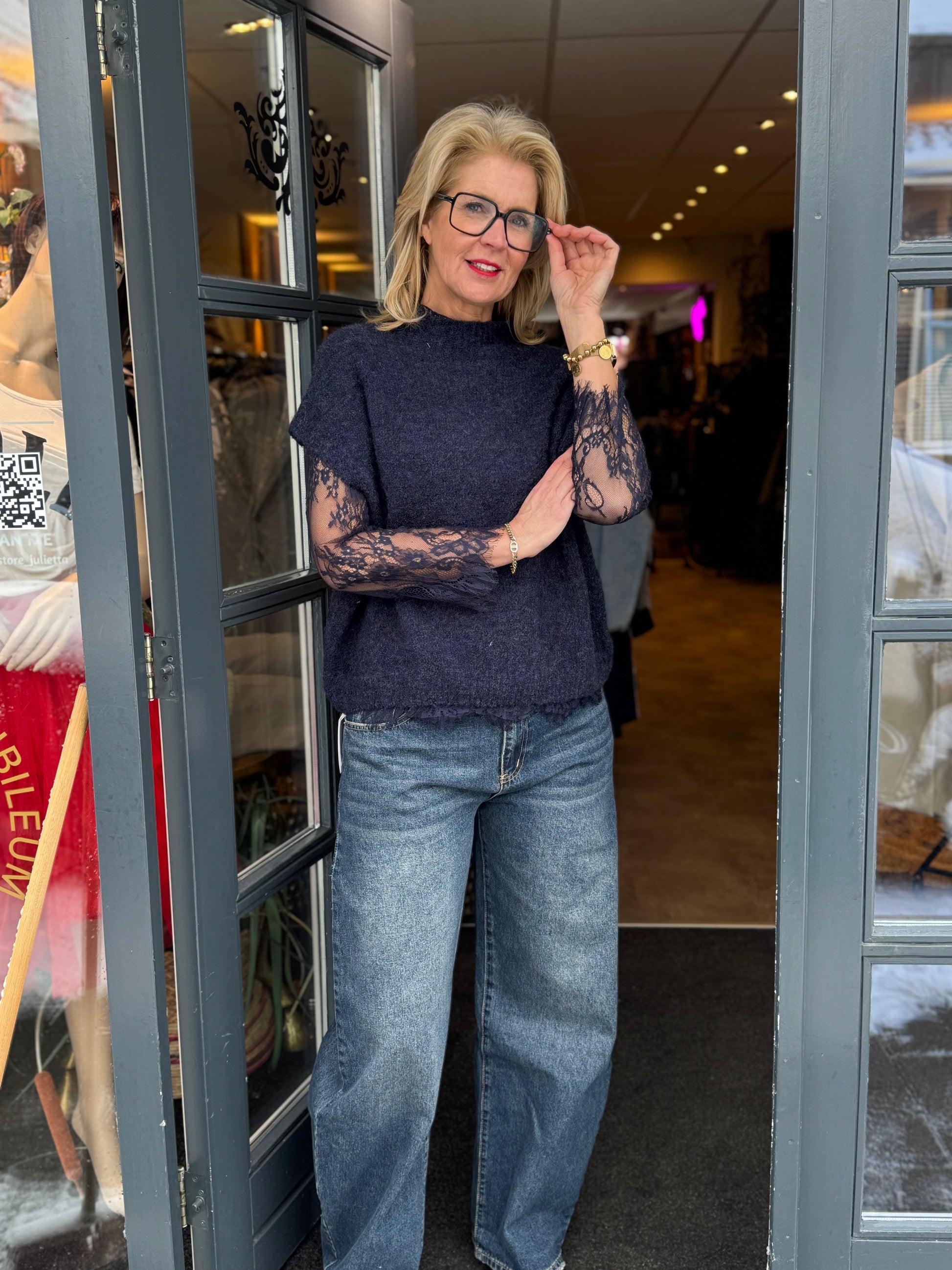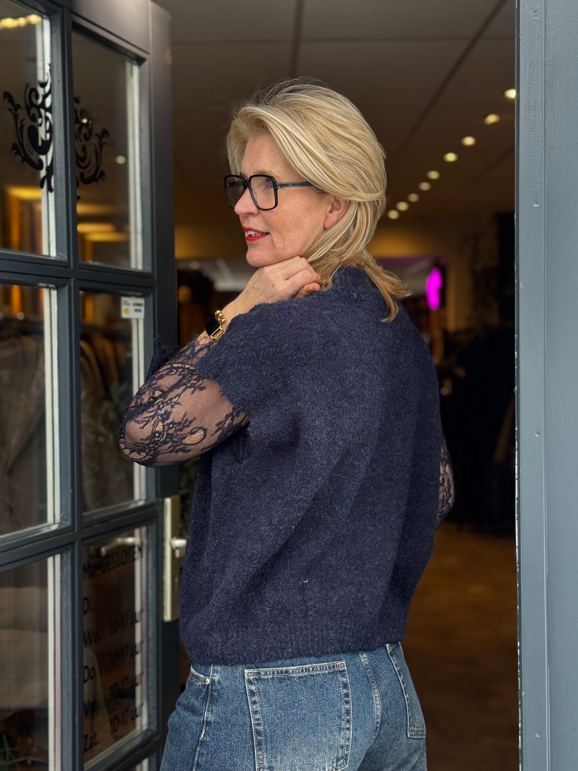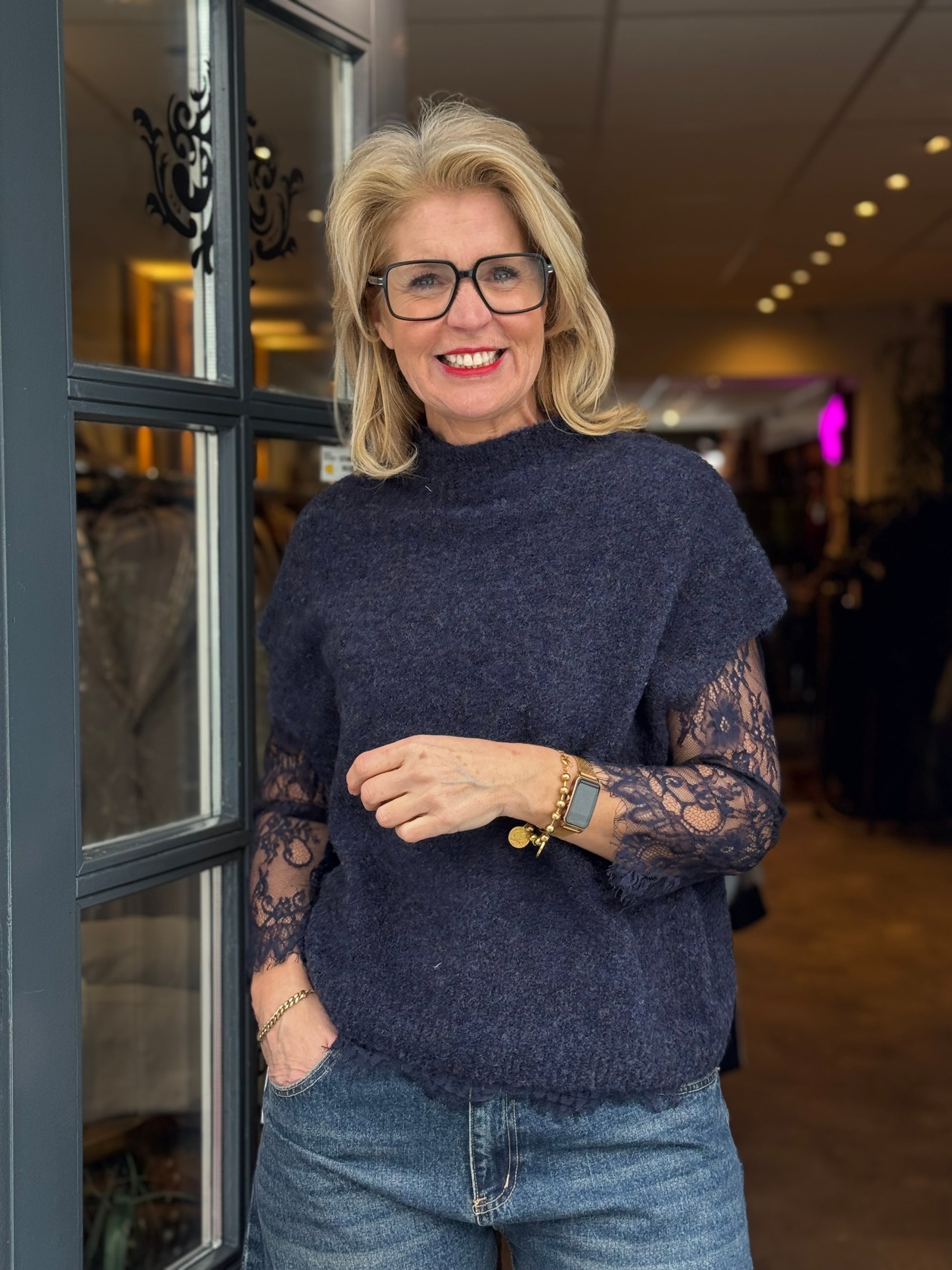 Dit stijlvolle 2-in-1 truitje combineert een mouwloze, zachte knit met een verfijnd kanten shirt.