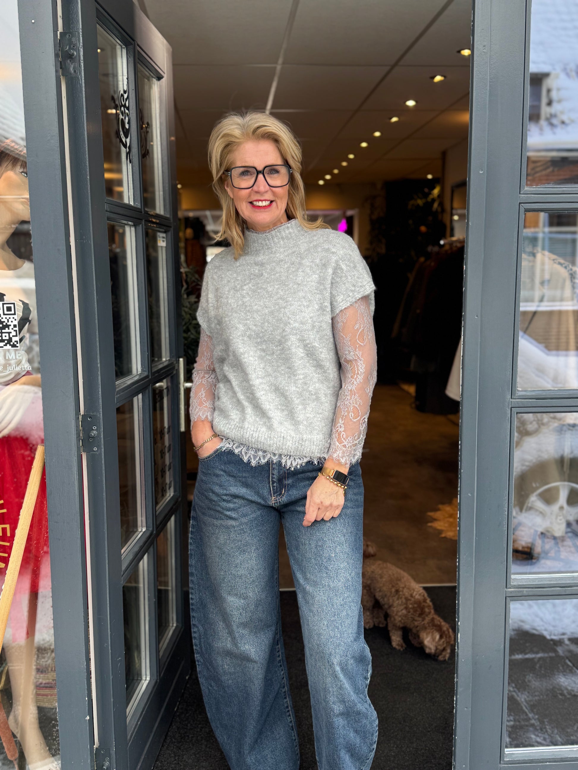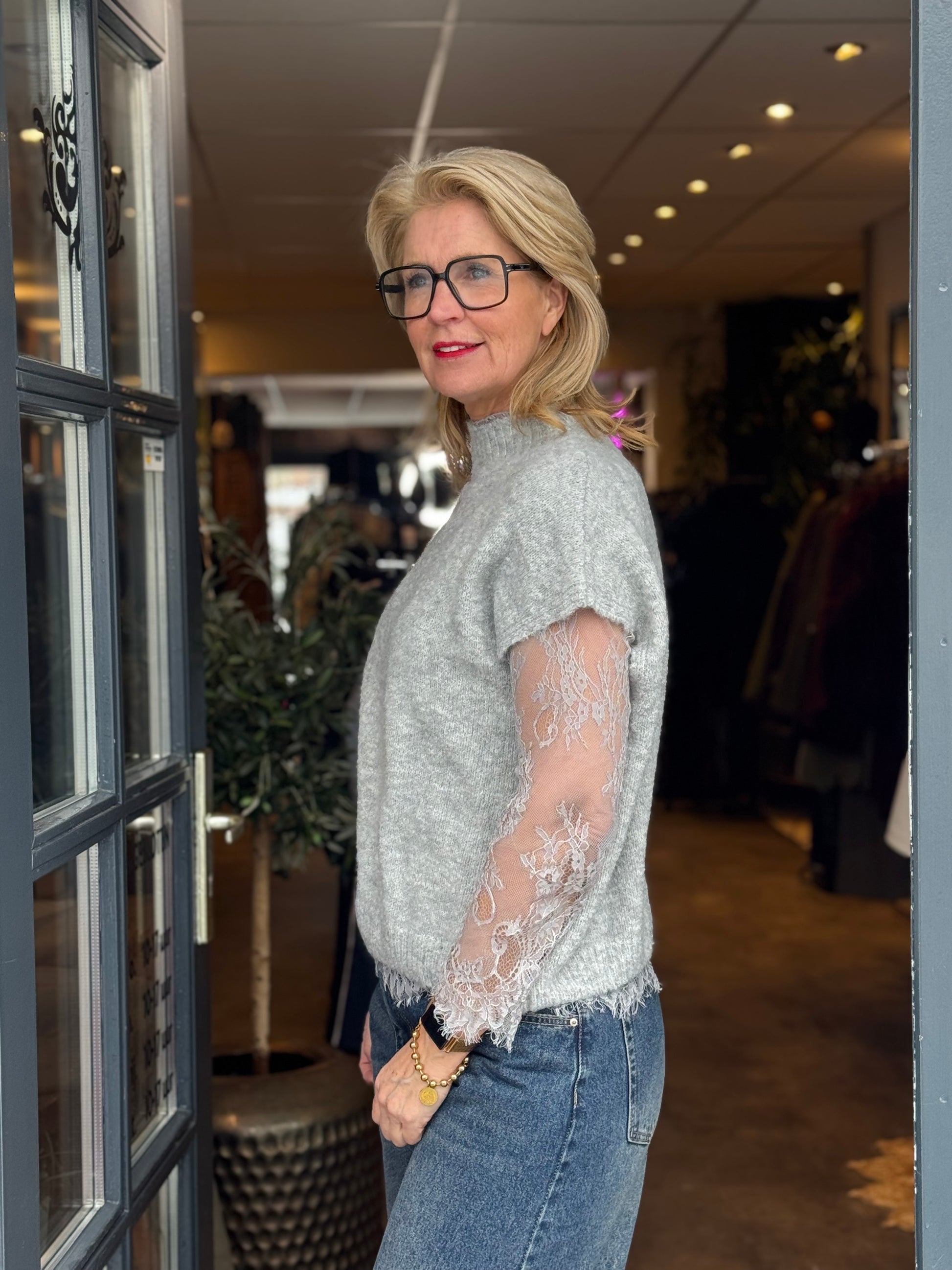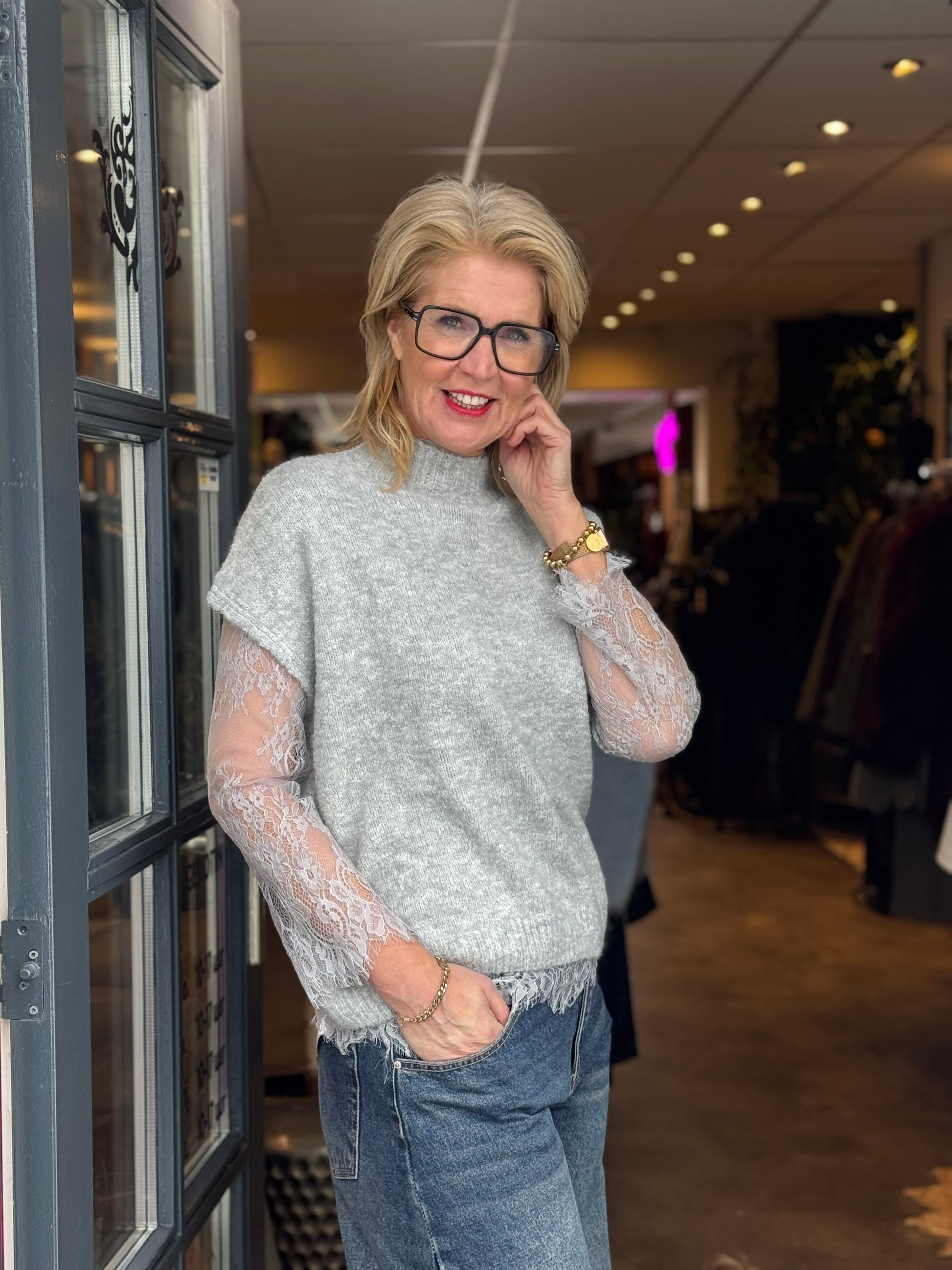 Dit stijlvolle 2-in-1 truitje combineert een mouwloze, zachte knit met een verfijnd kanten shirt.