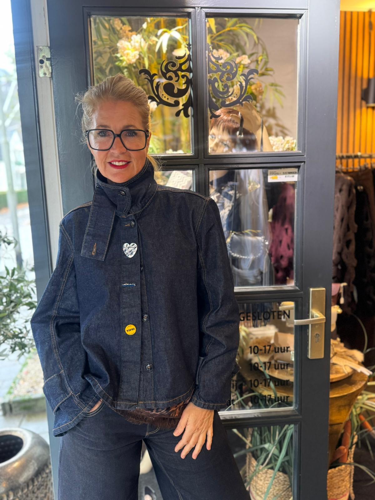 Dit unieke jeansjasje is verfijnd afgewerkt met speelse broches, een stijlvolle kraag en een charmante mouw.