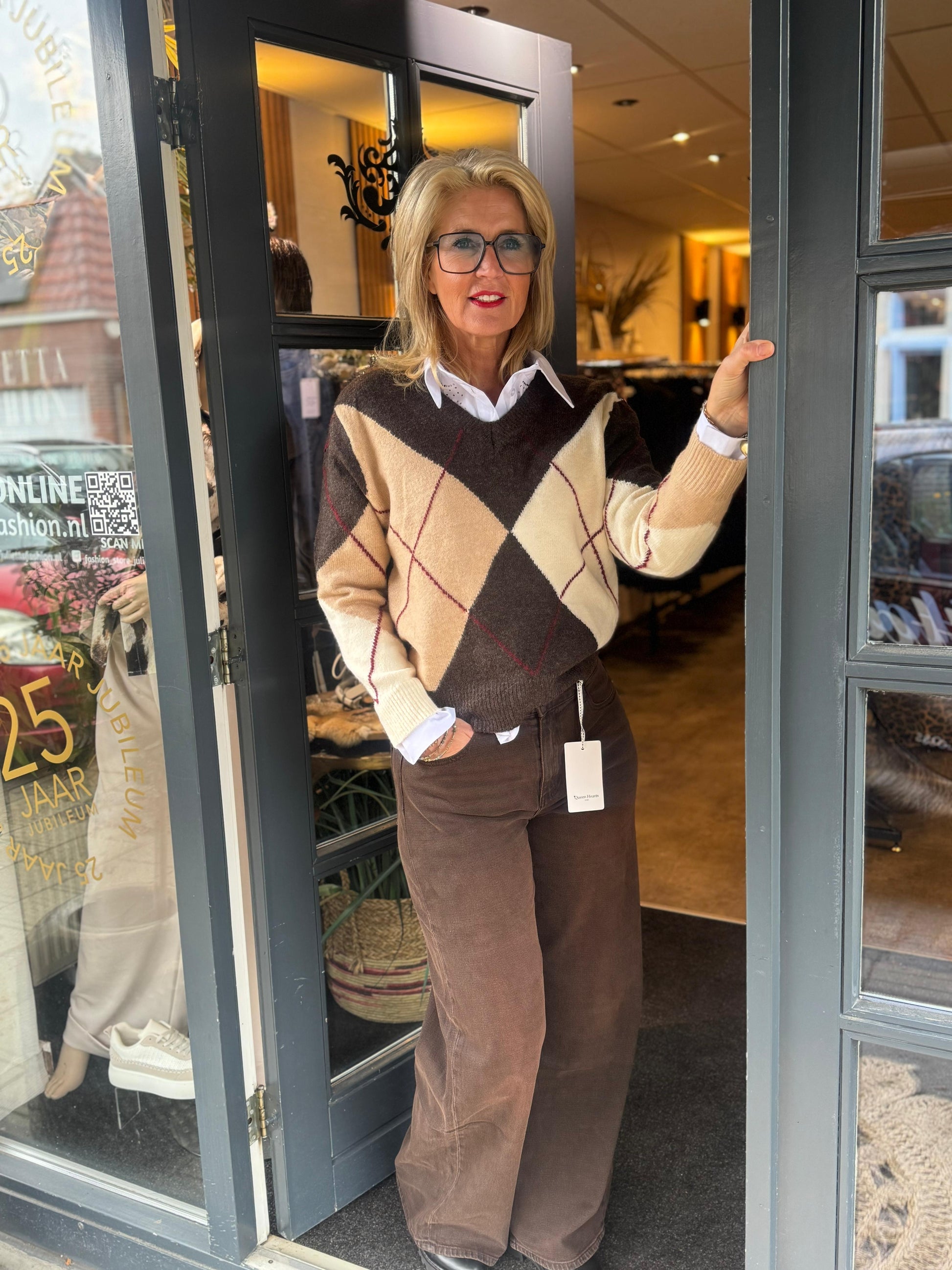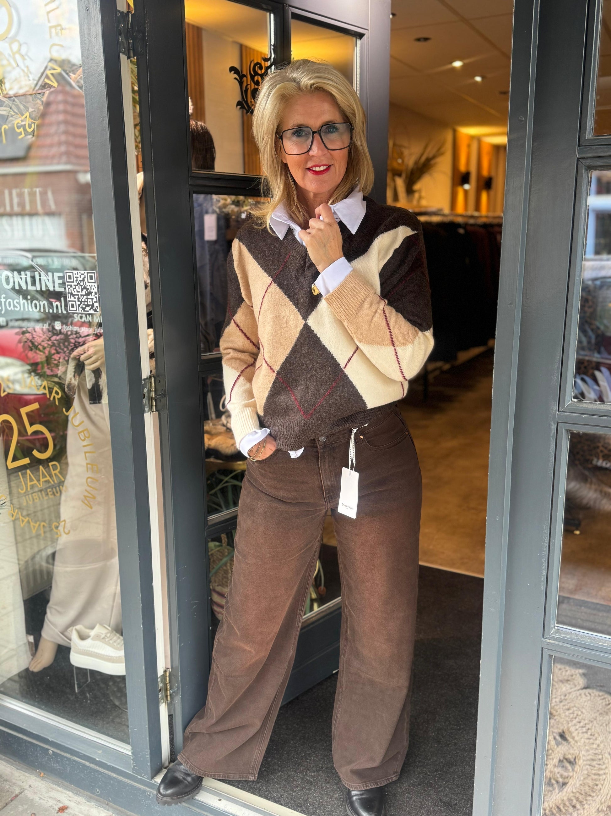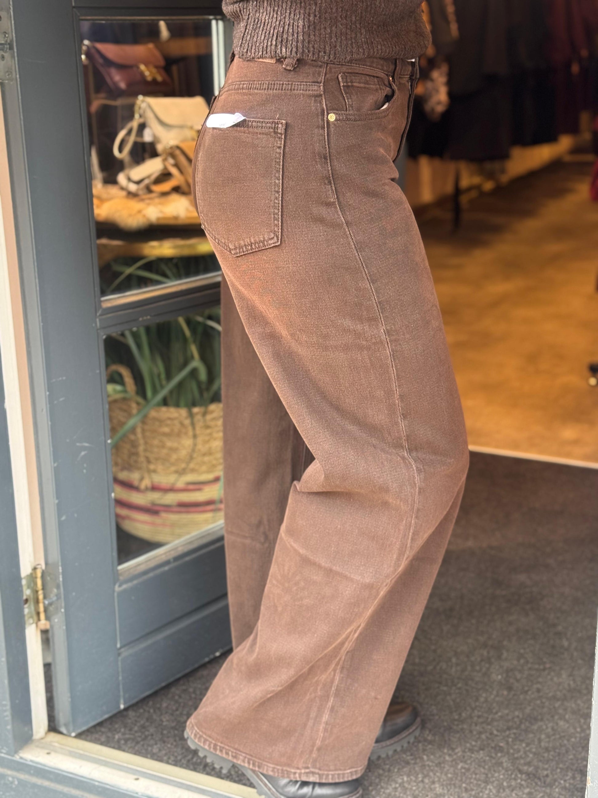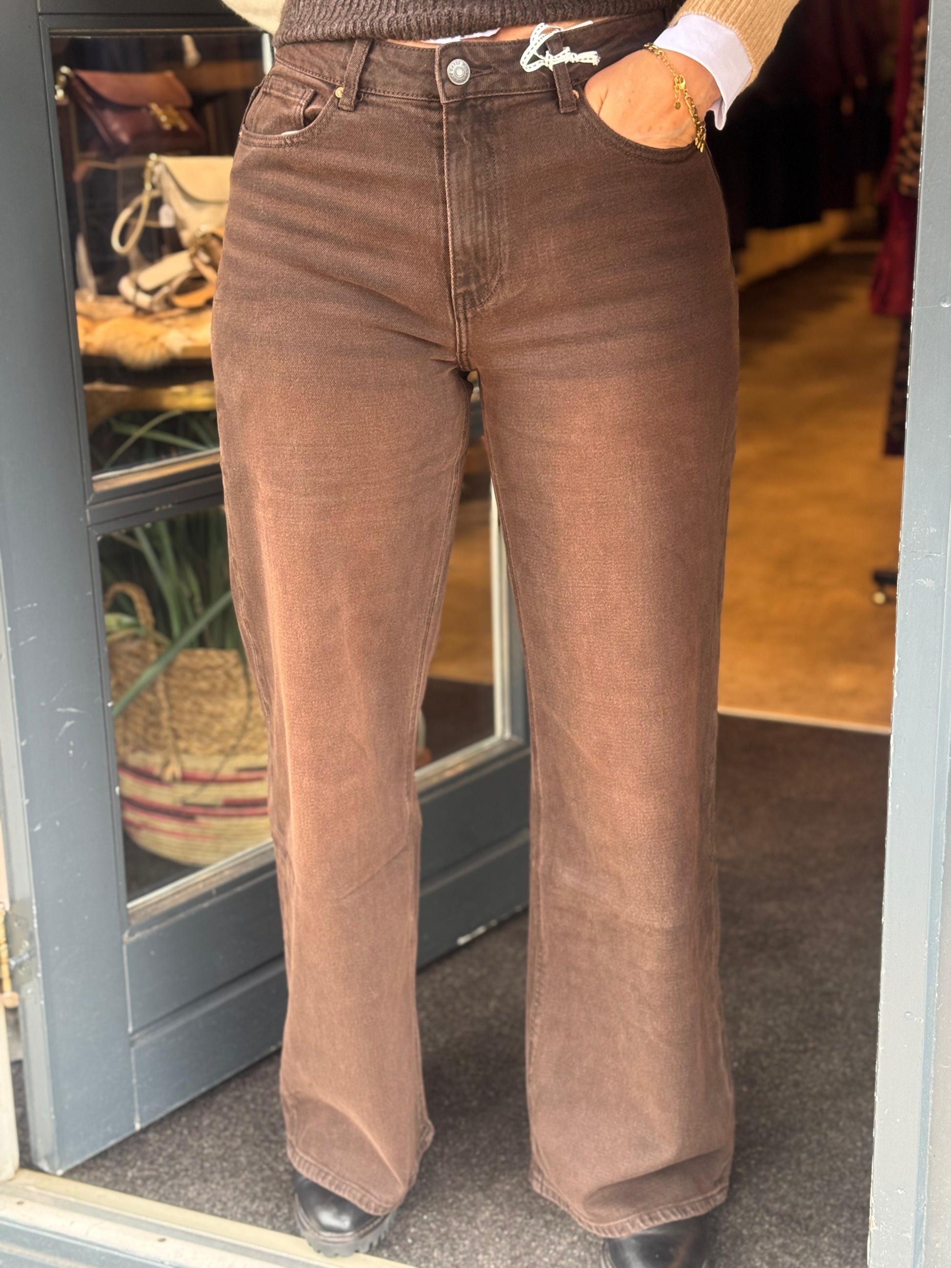 Deze jeans in warme mocca tint heeft alles: een hoge taille, wijde pijpen en een vleugje vintage charme.