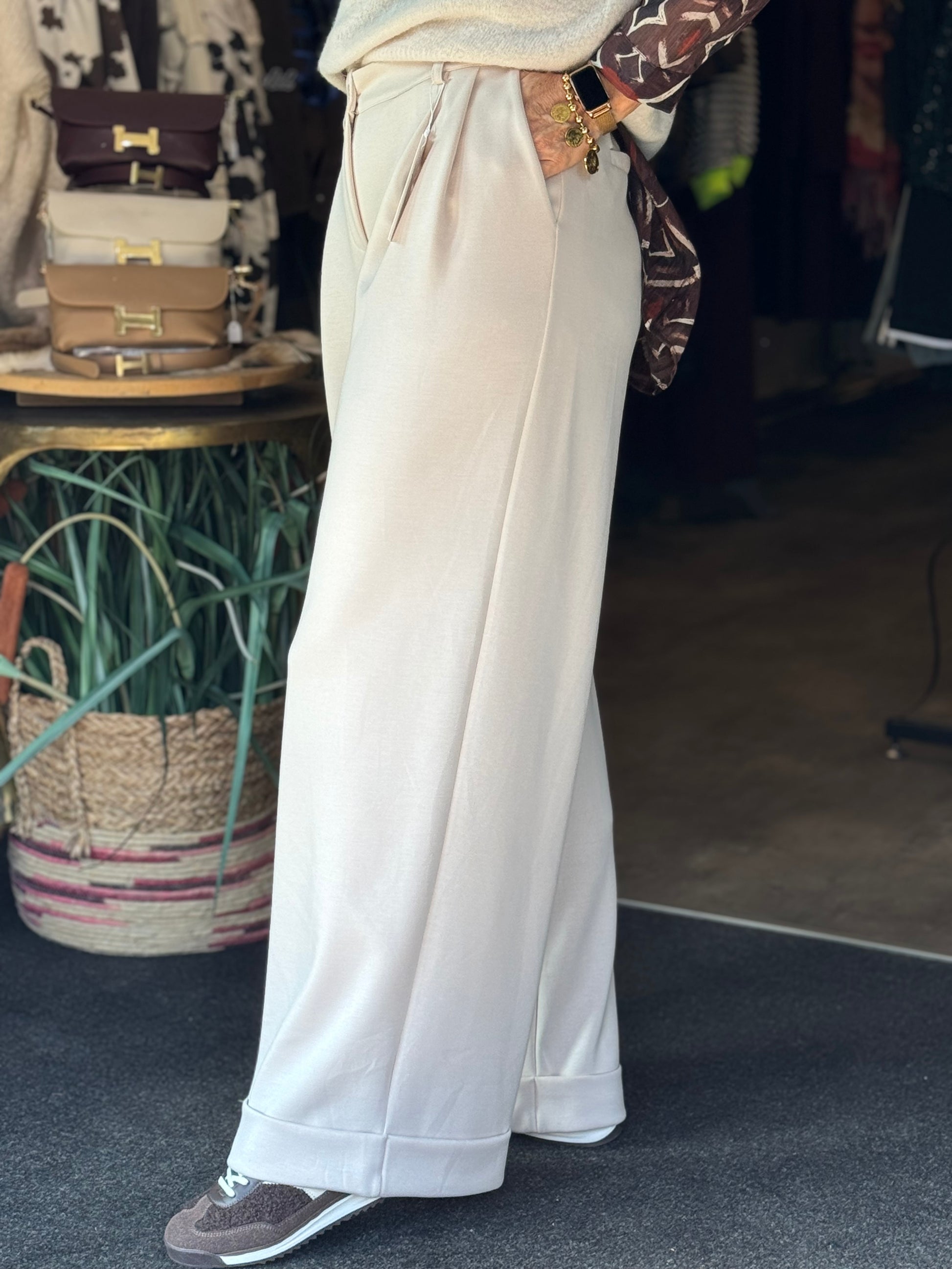 Een stijlvolle pantalon met bandplooi en omslag, uitgevoerd in een zachte stretch stof.