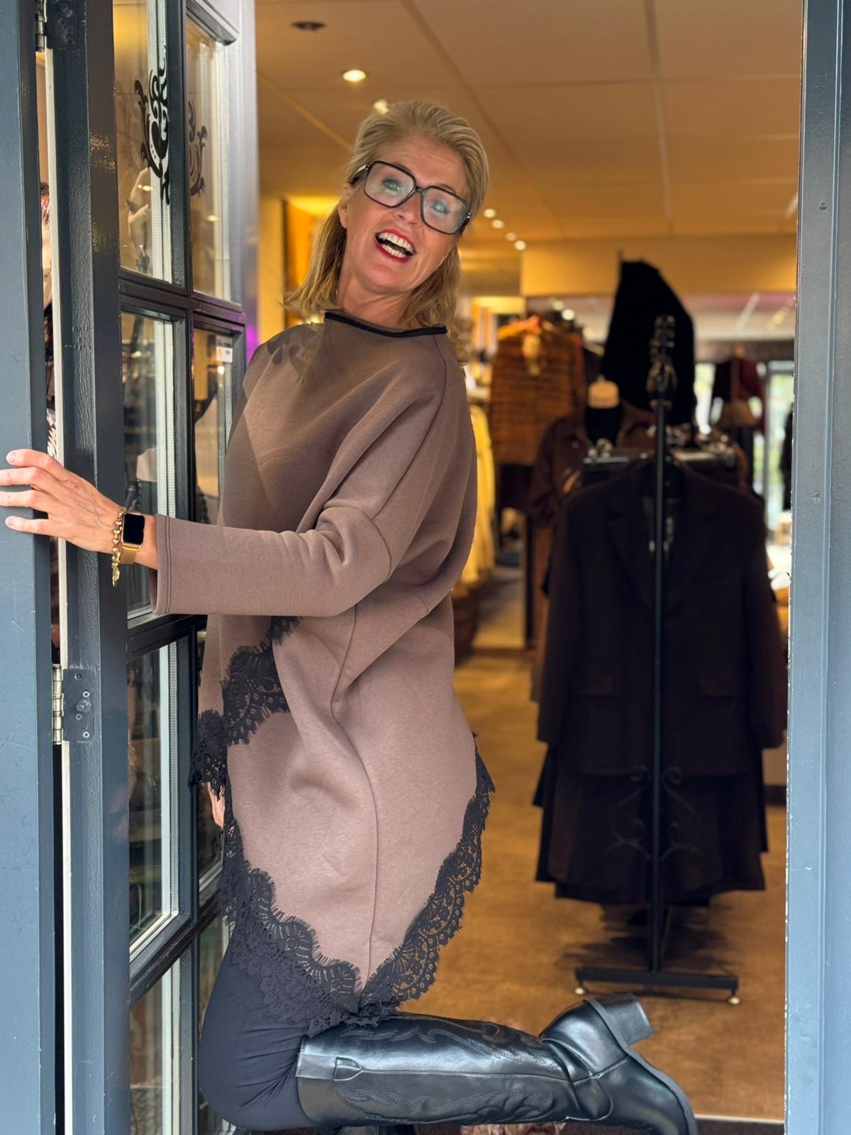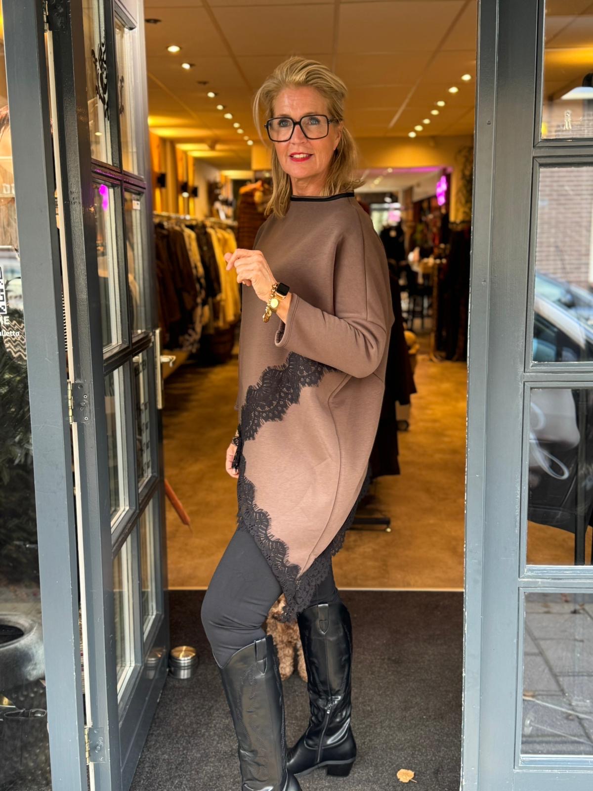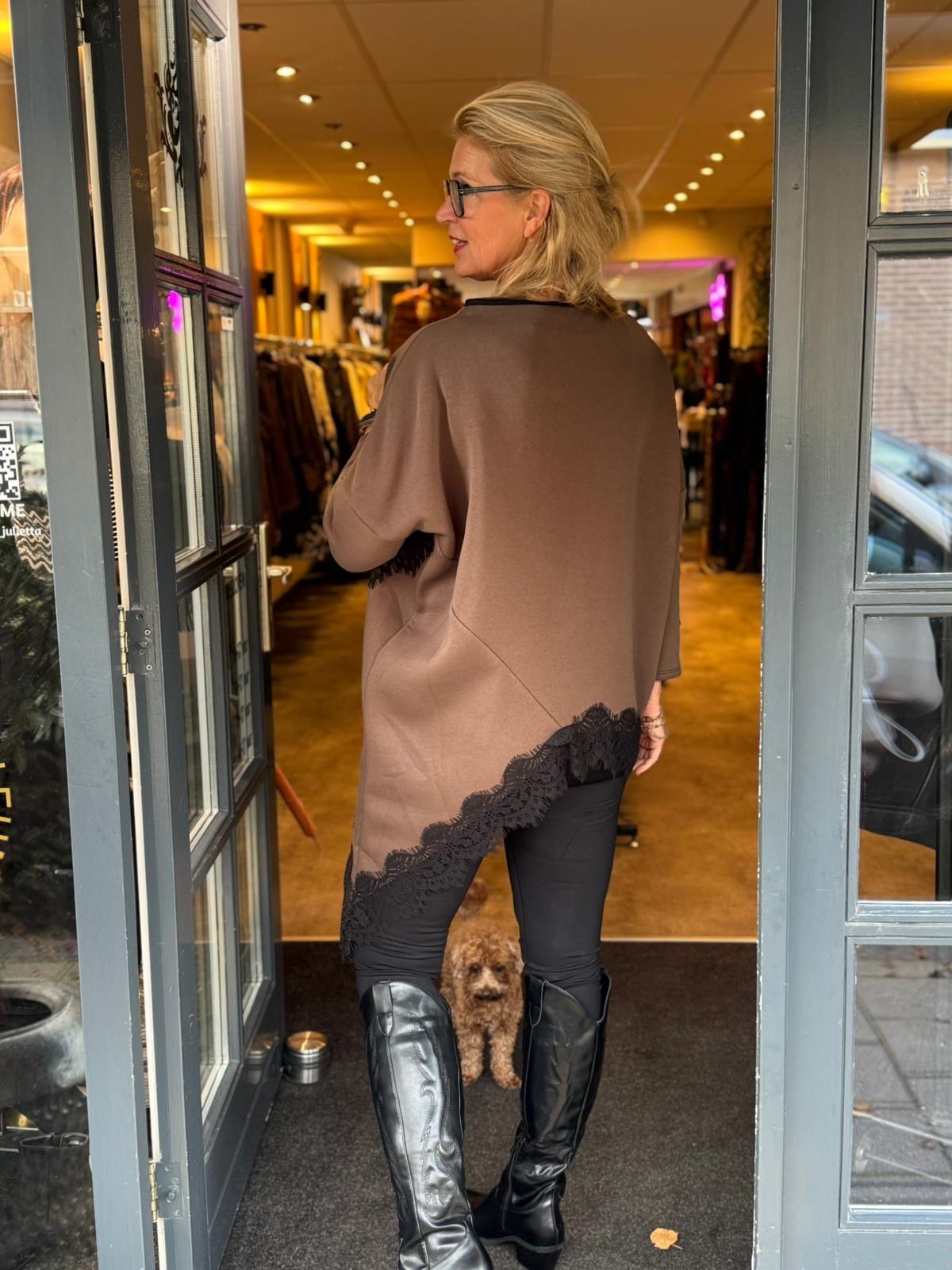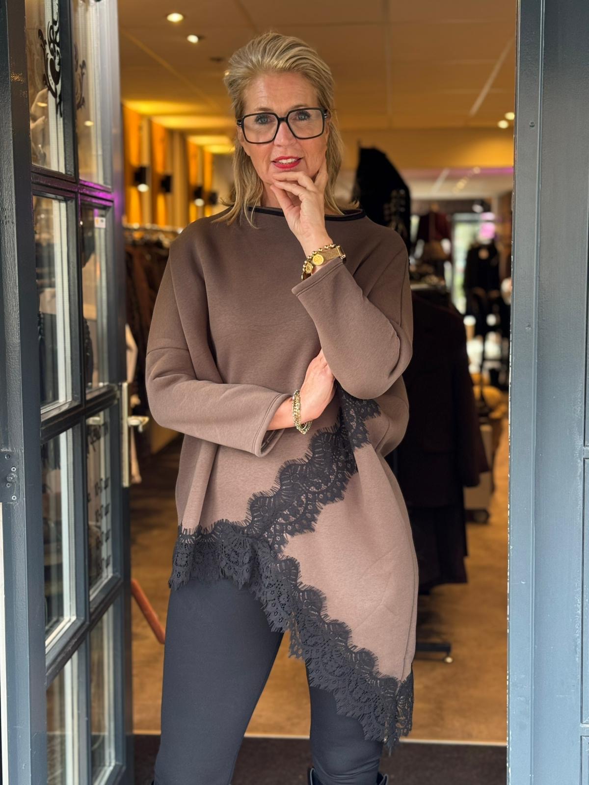 Maak een statement met deze stijlvolle sweater, afgewerkt met elegante zwarte kantdetails. Asymmetrische model in dikkere JogStof.