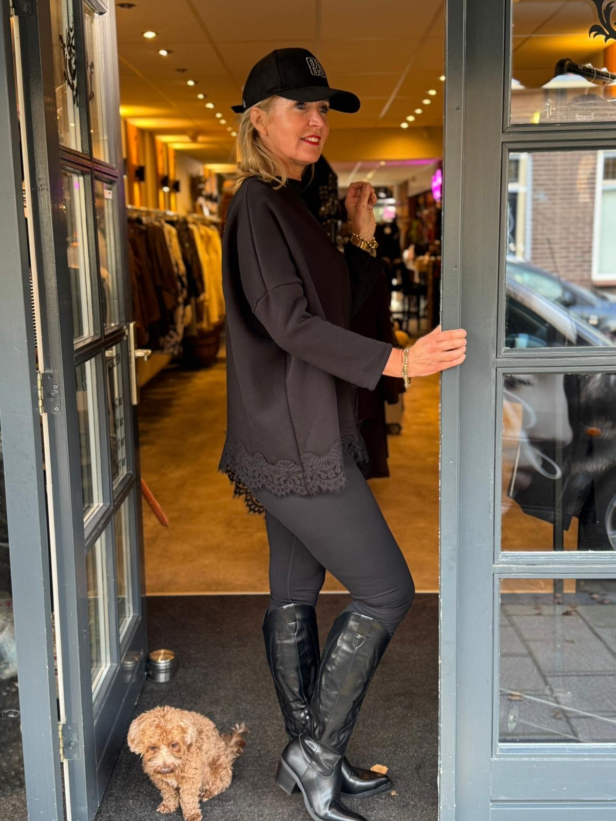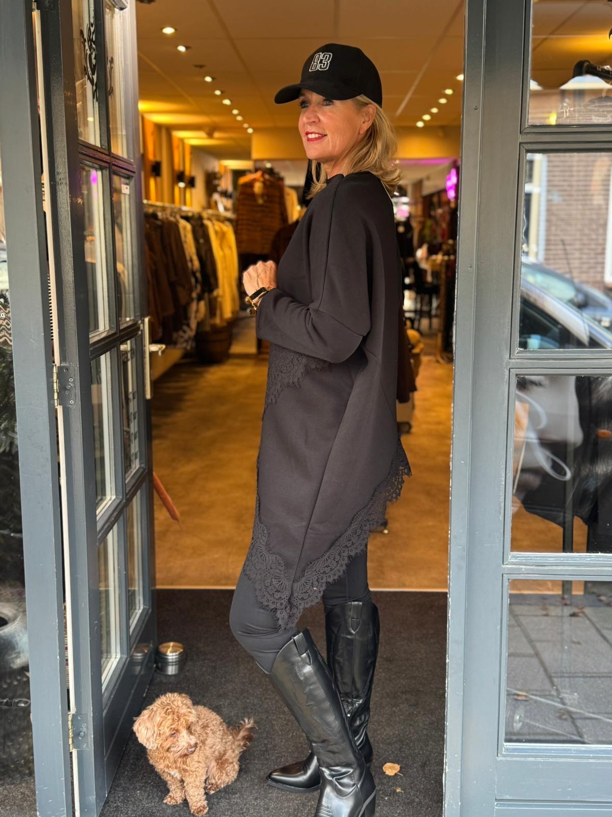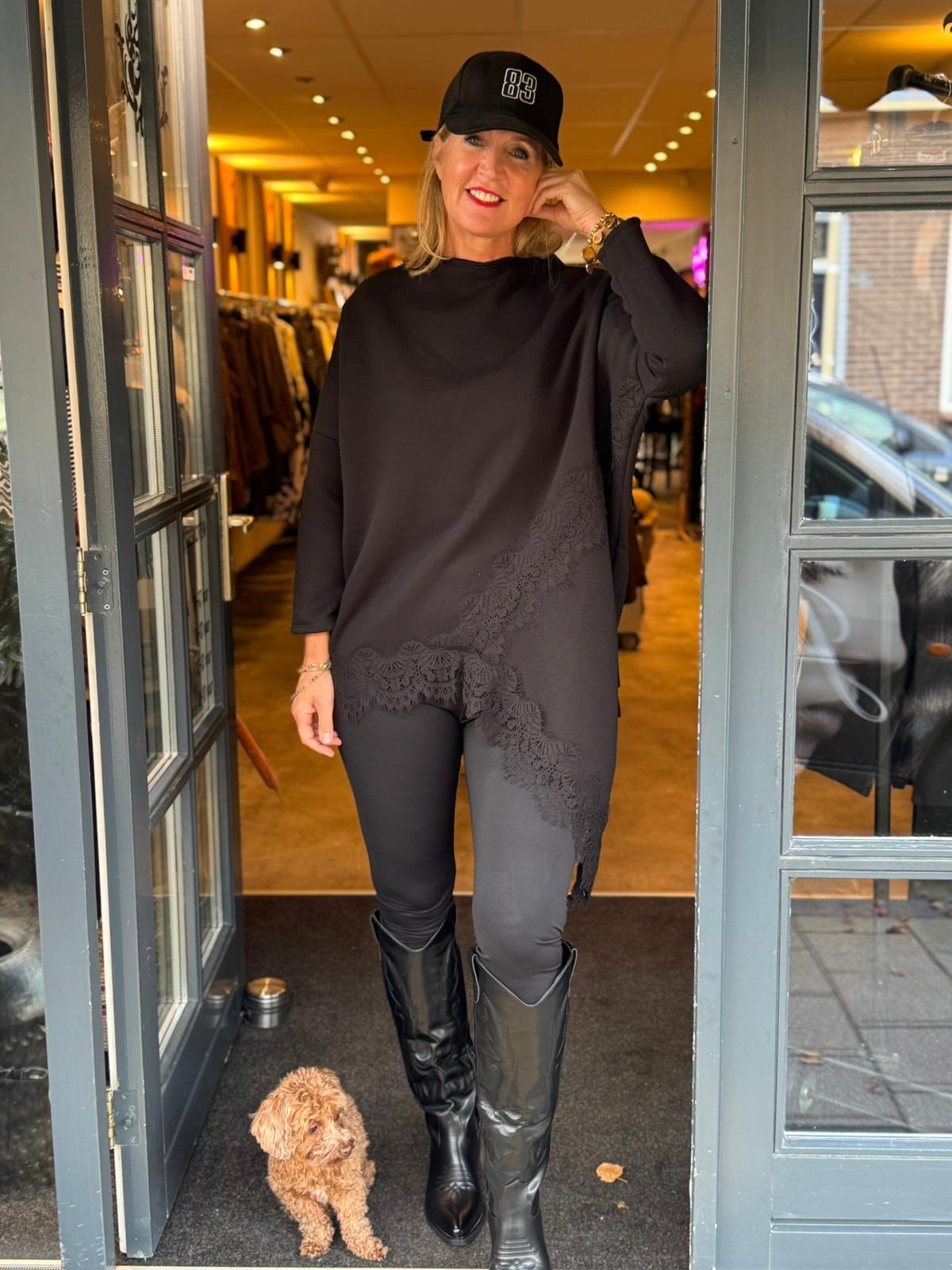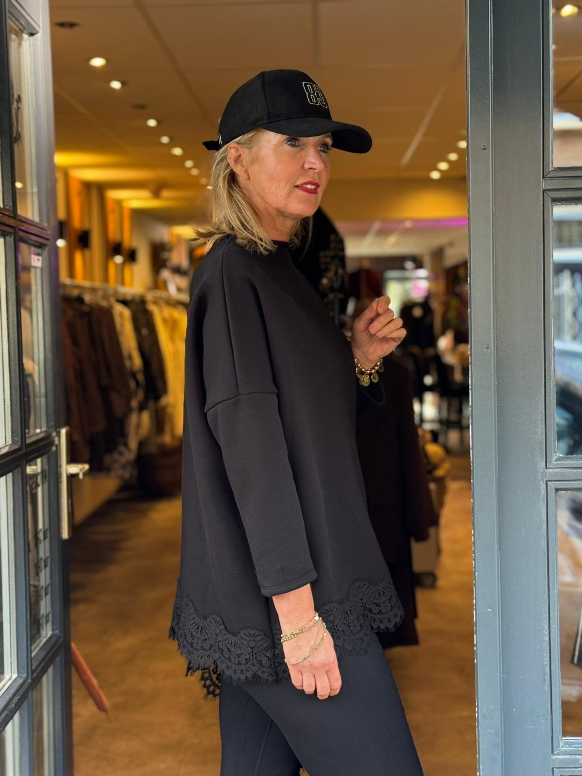 Maak een statement met deze stijlvolle sweater, afgewerkt met elegante zwarte kantdetails. Asymmetrische model in dikkere JogStof.