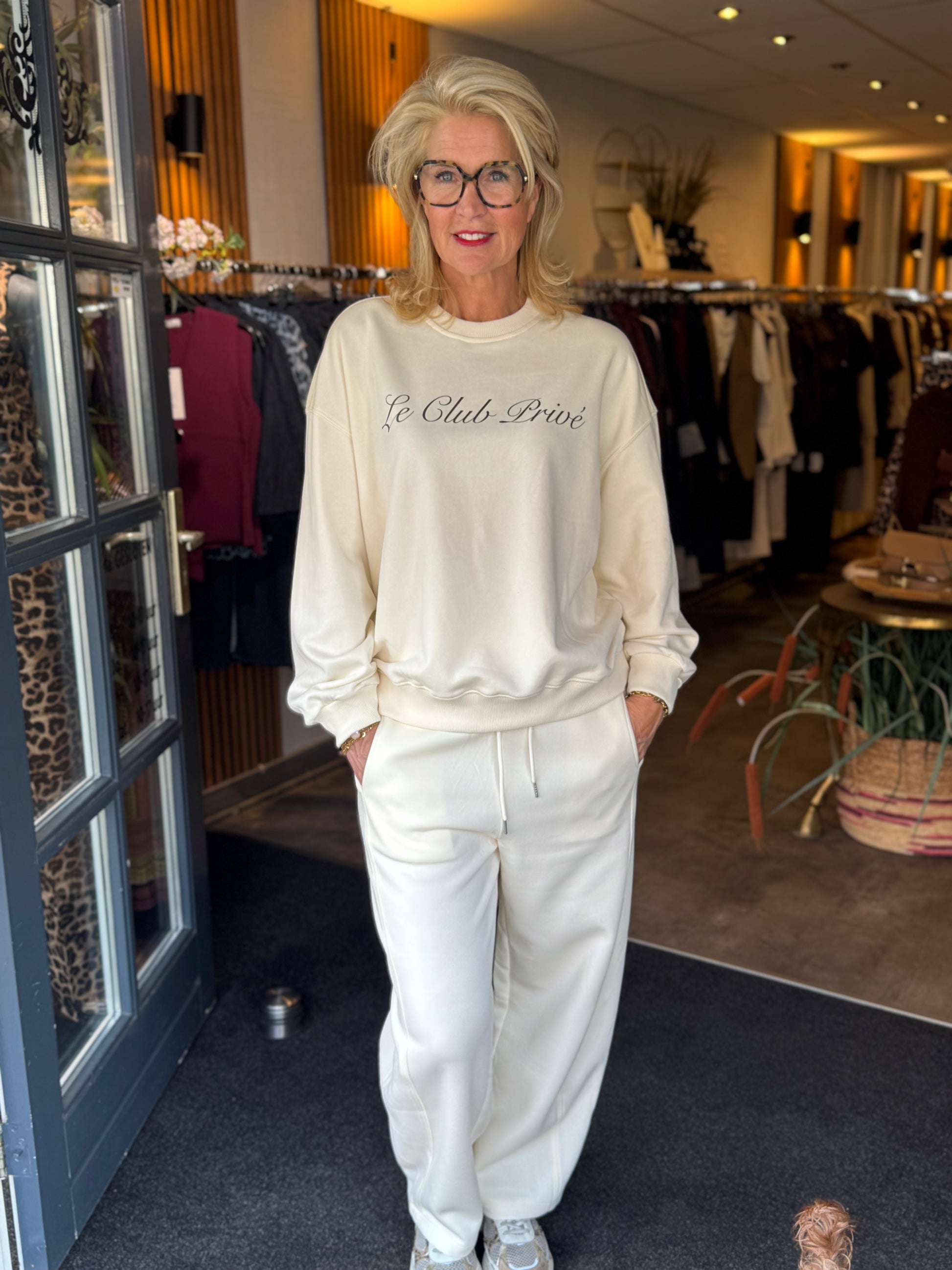 Deze oversized sweater in zacht crème met bruine tekst is hét recept voor casual cool.