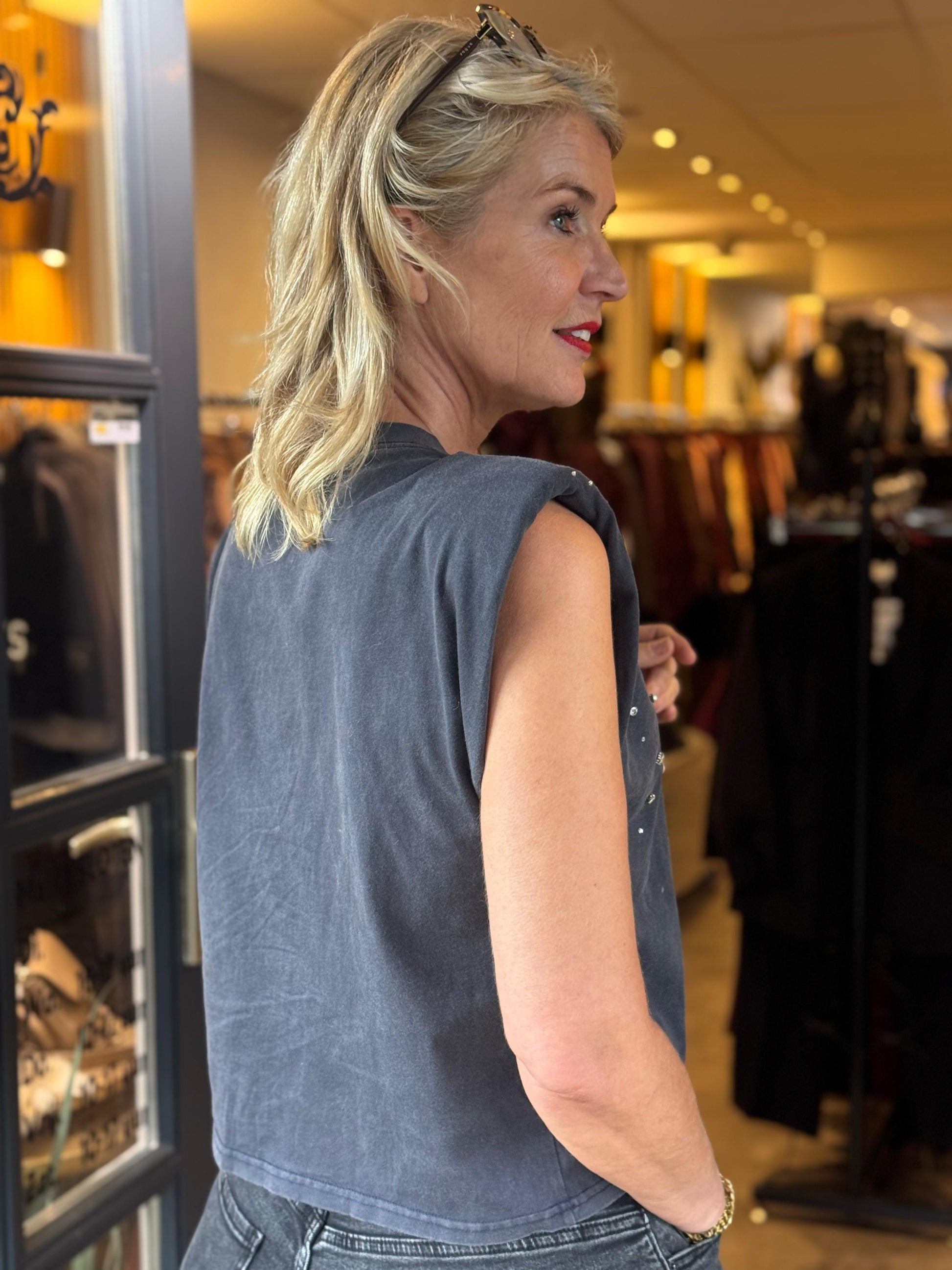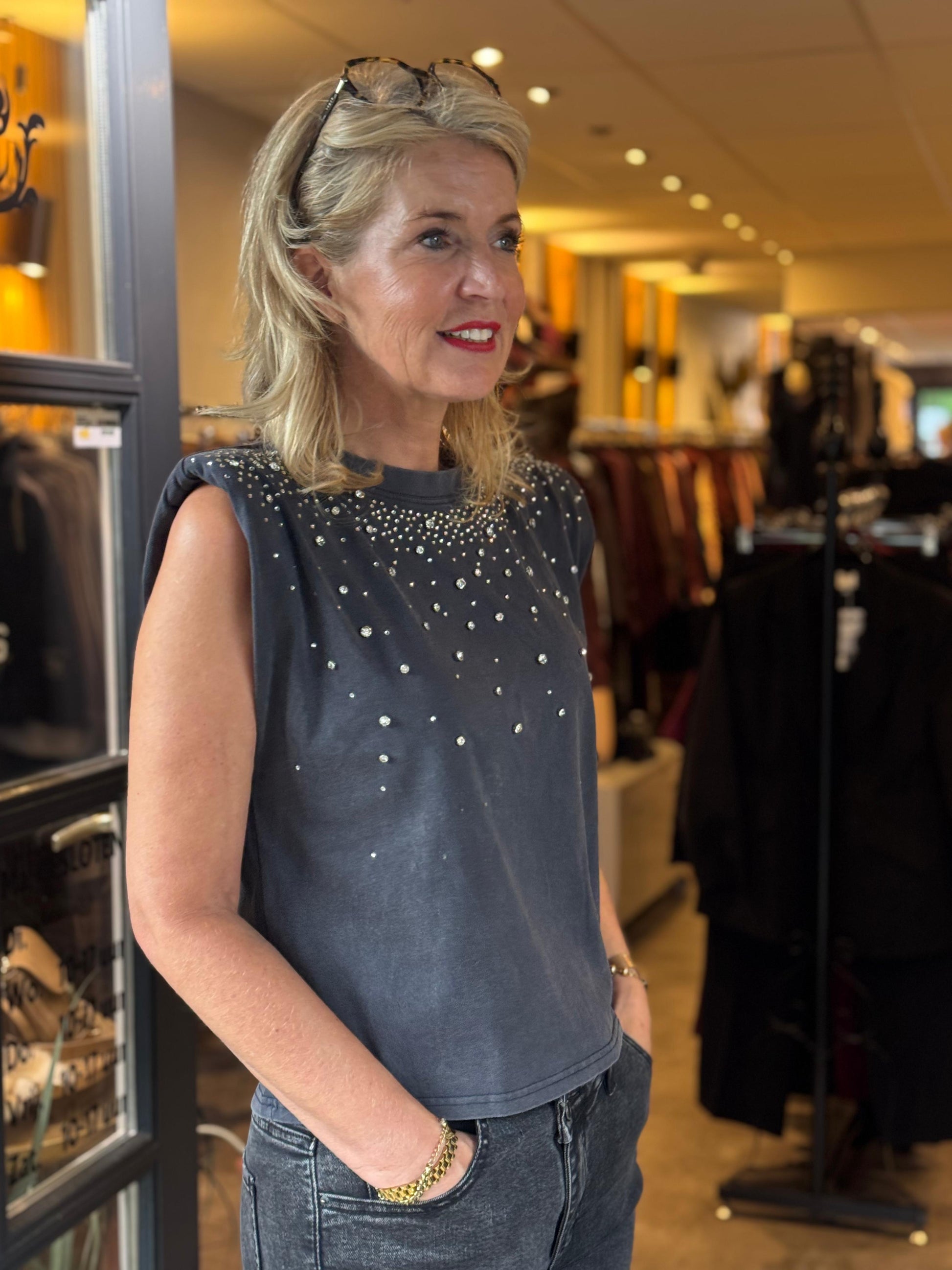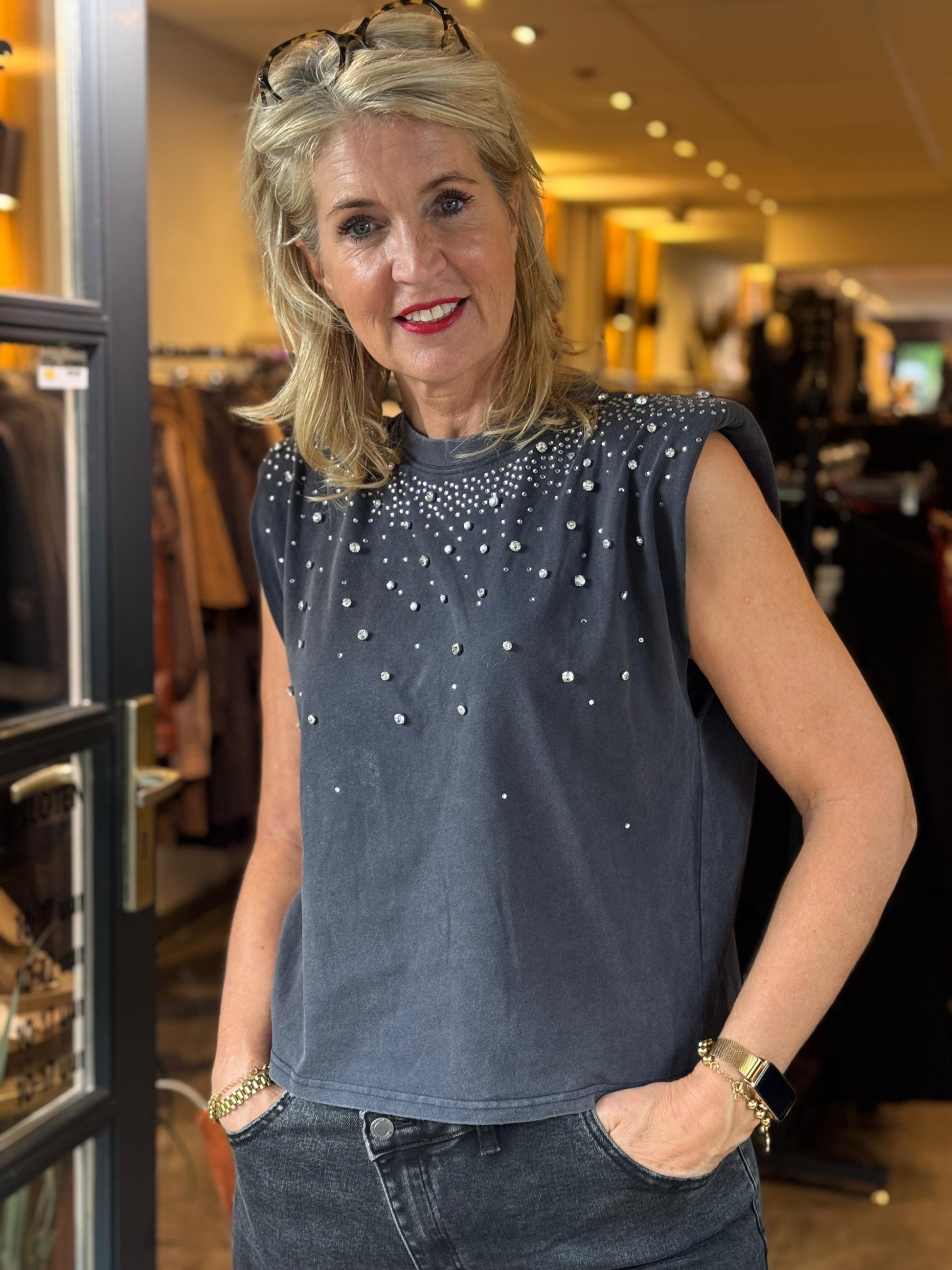 De subtiele schoudervulling zorgt voor een krachtige silhouet, terwijl de studs en fonkelende steentjes een edgy luxe uitstraling toevoegen.