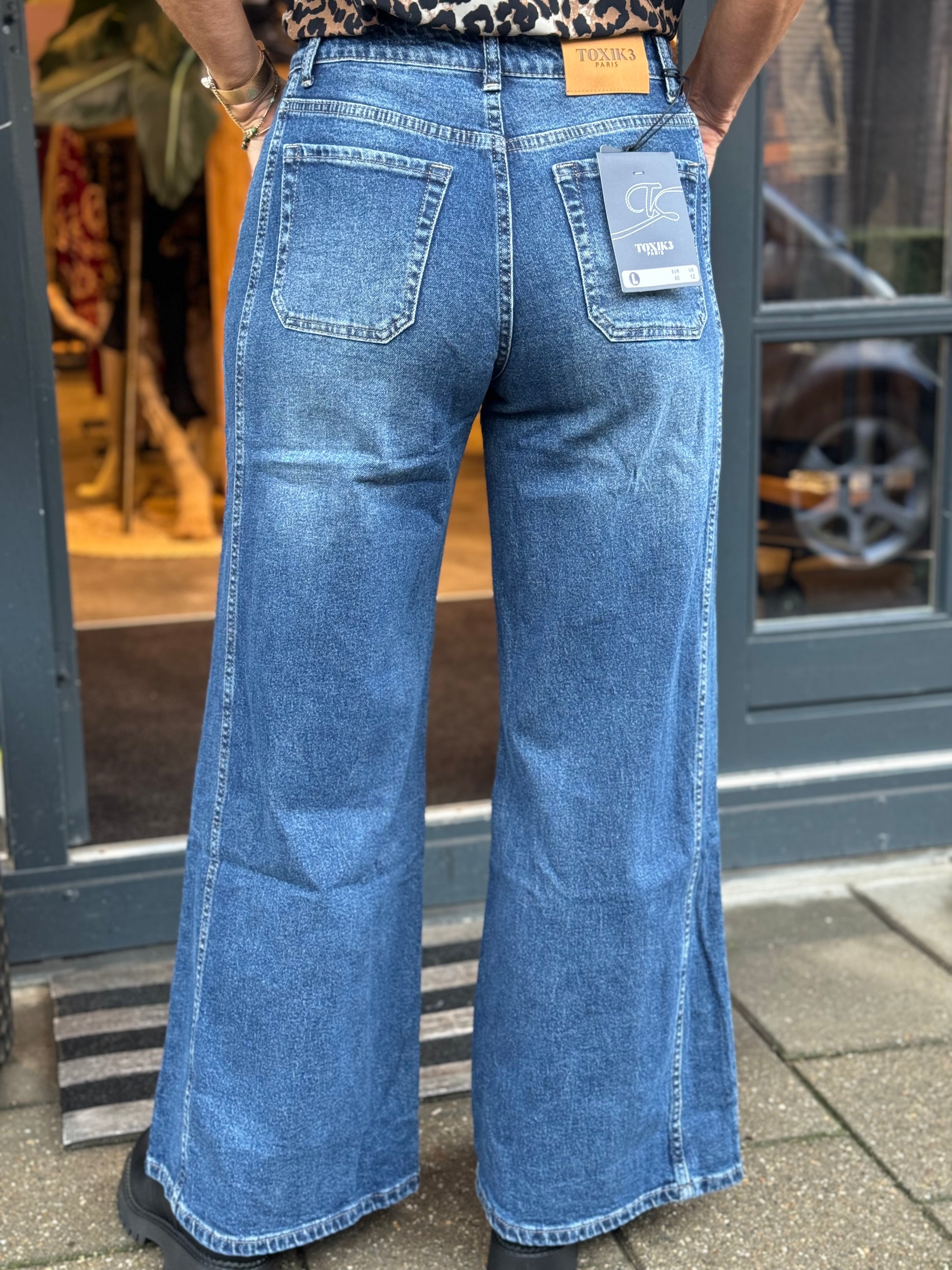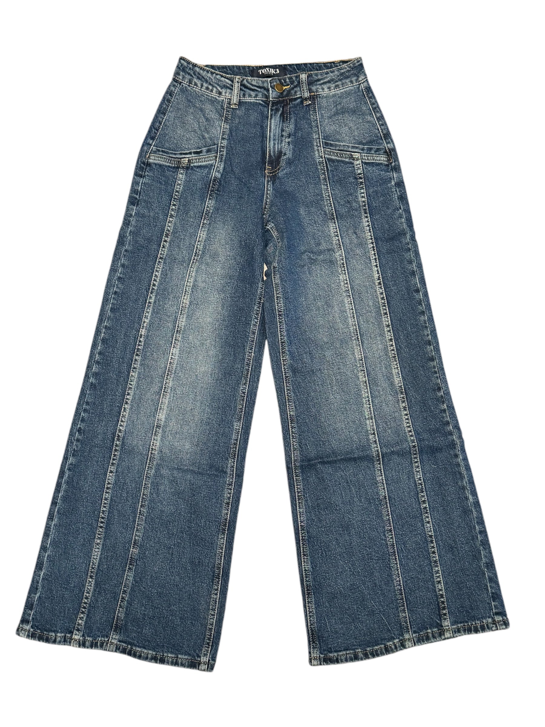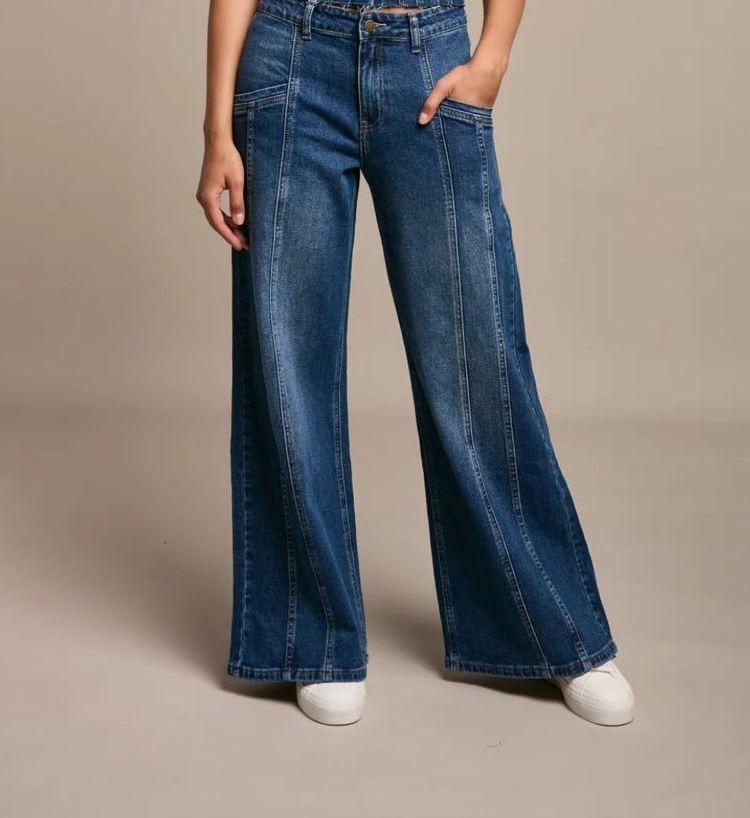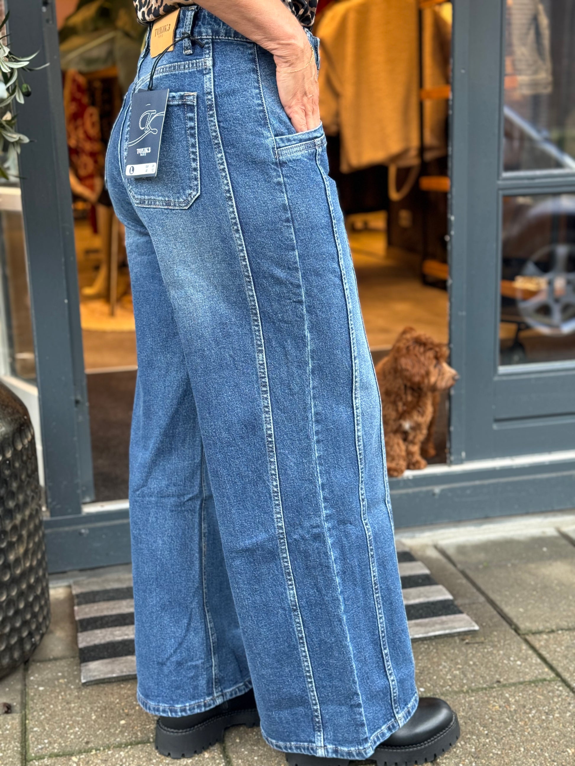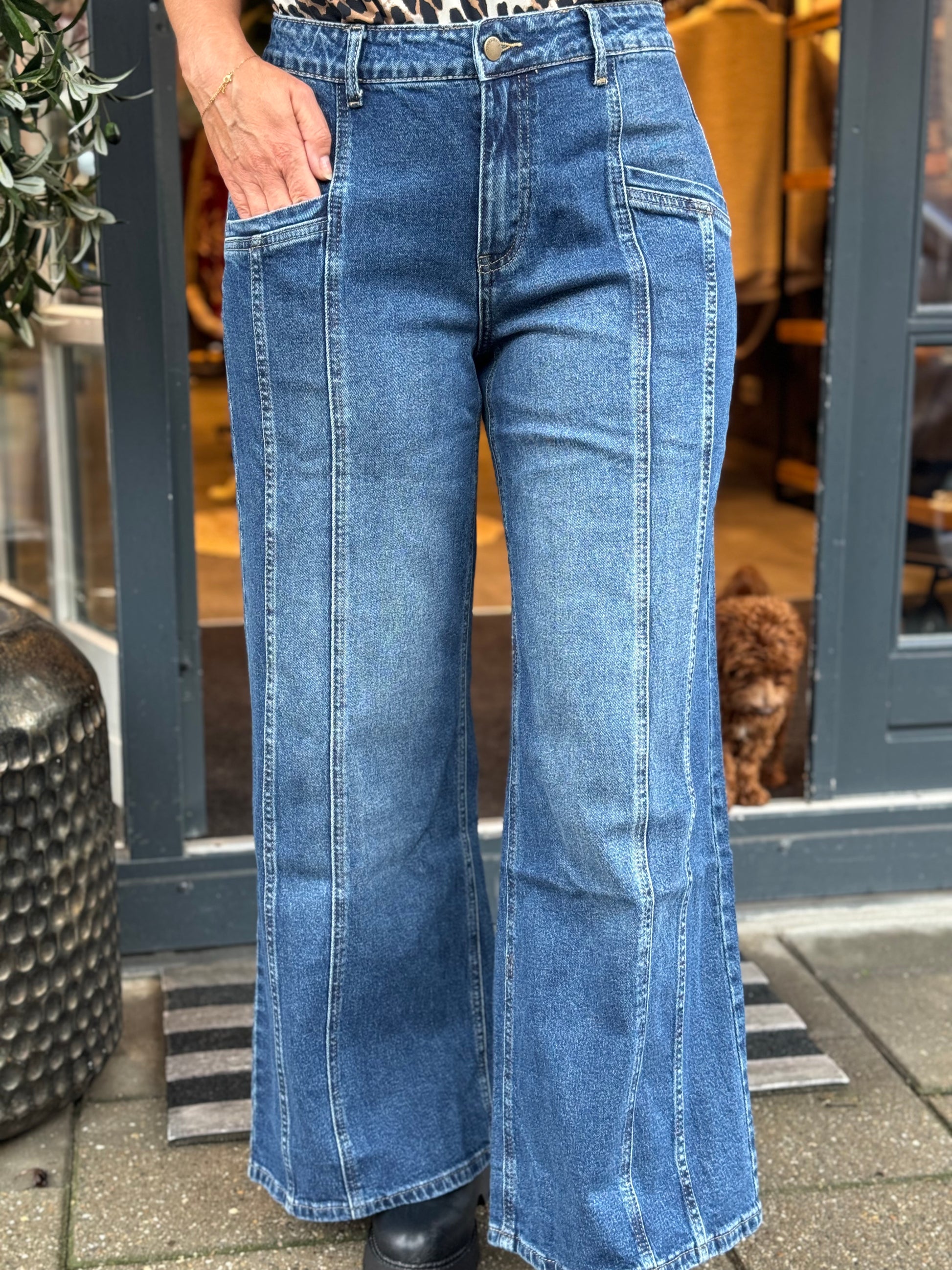 Deze unieke jeans met wide leg model en opvallende naden over de beenlengte zorgen voor een slankere look bij heupen en billen.