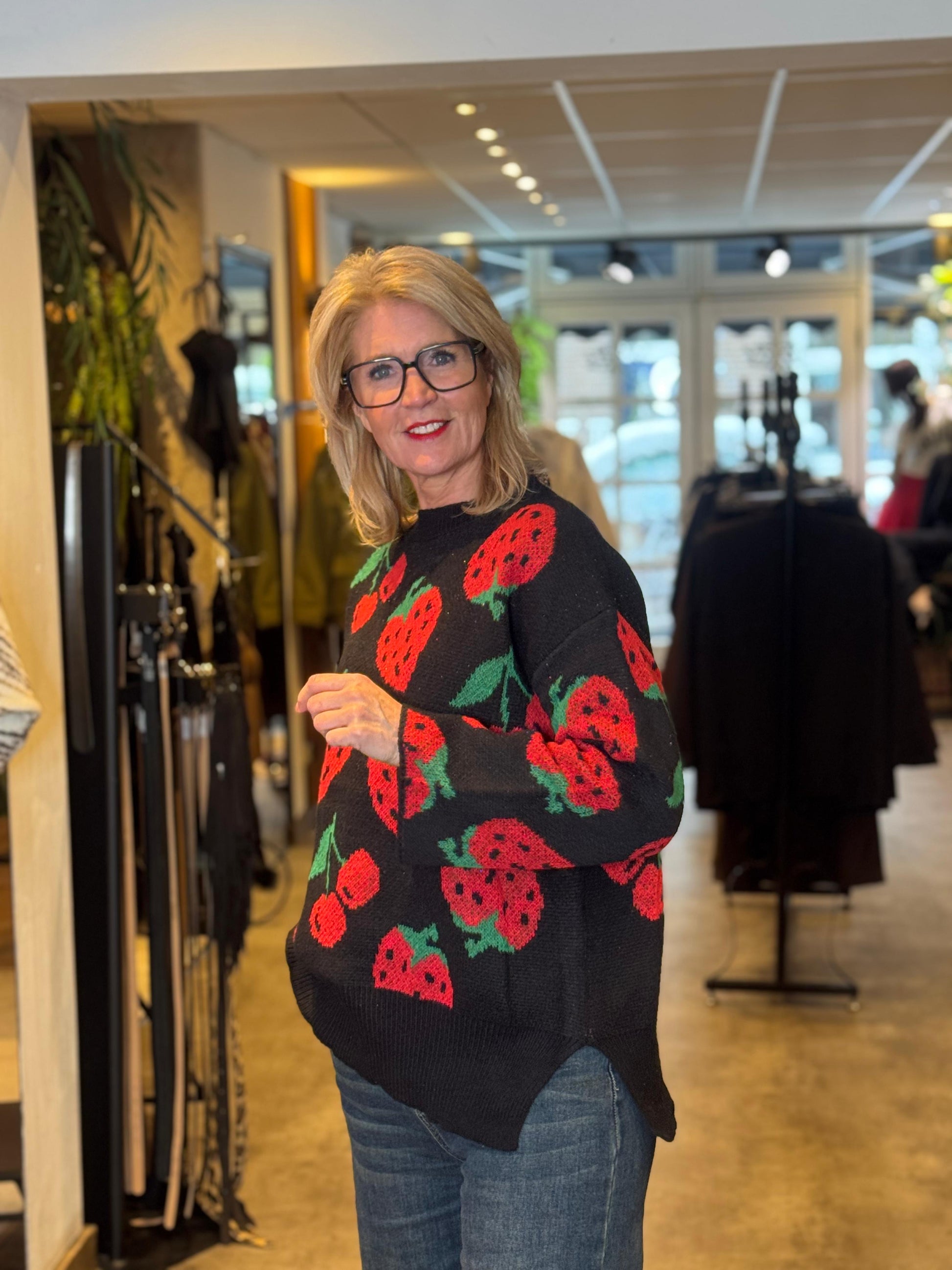 Deze gebreide trui met aardbeienafbeelding combineert comfort met een speelse look.