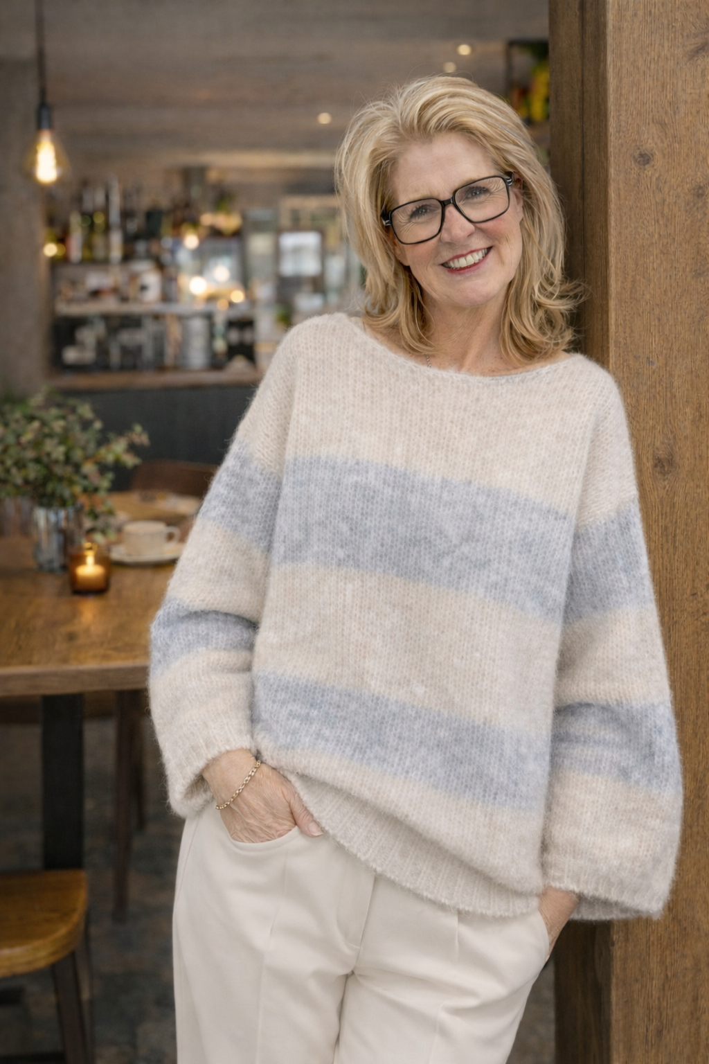 Deze lichte trui met subtiele strepen voelt heerlijk comfortabel en geeft elke outfit een elegante, moderne uitstraling – perfect voor elke dag. ✨