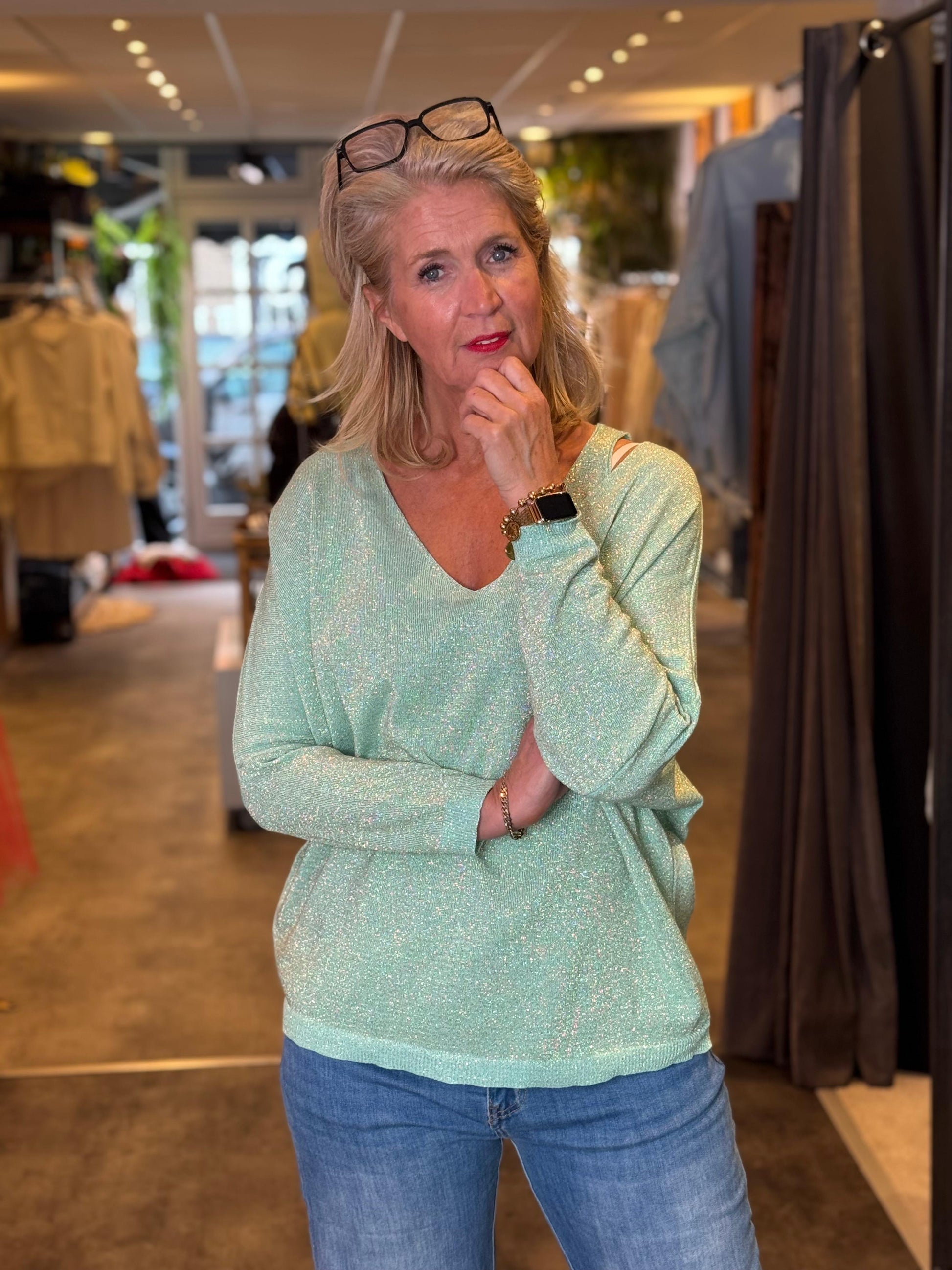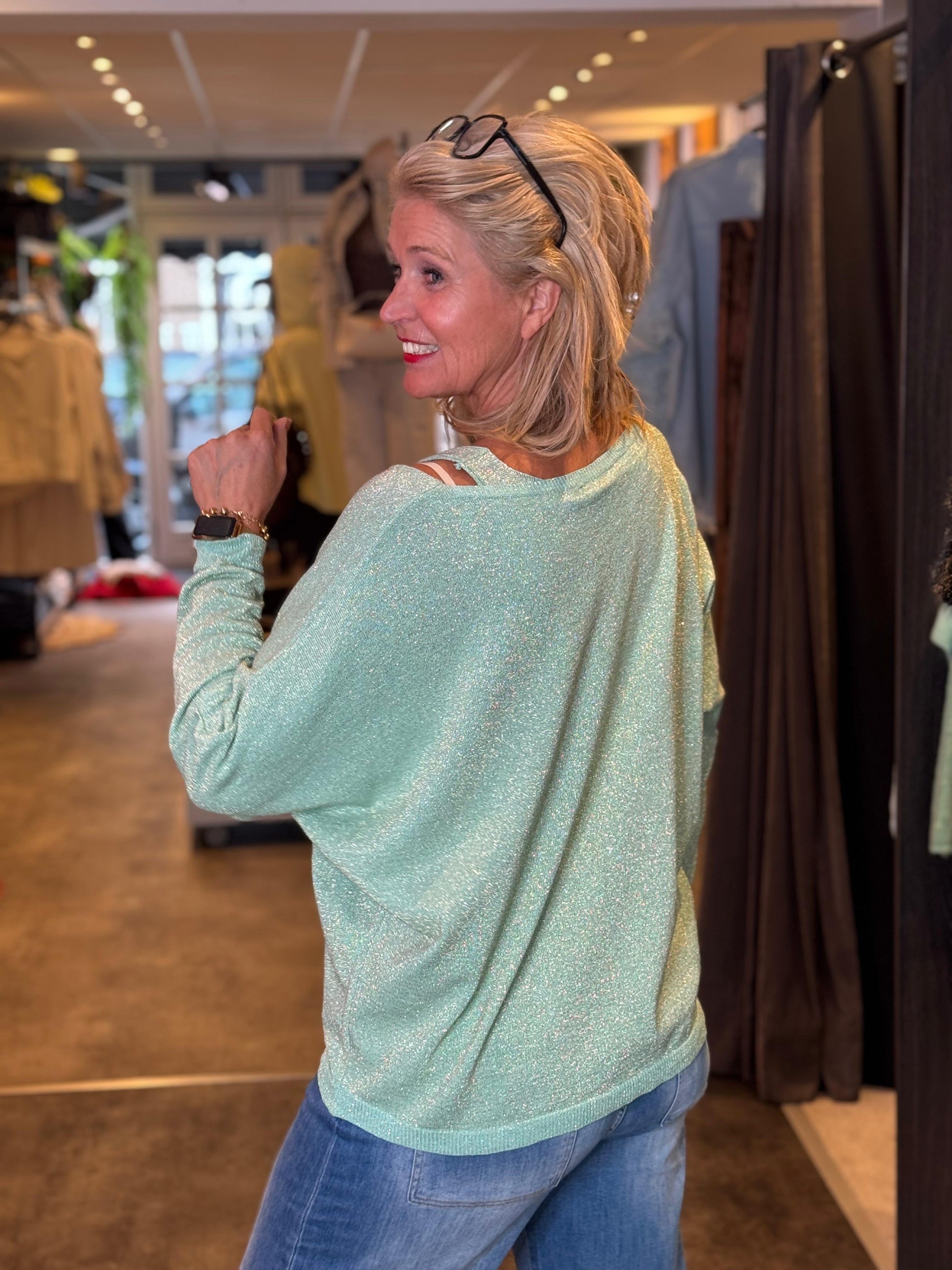 Luchtige vlindertrui met subtiele glans, elegante V-hals en bijpassend topje — soepelvallend, vrouwelijk en perfect om in te shinen.