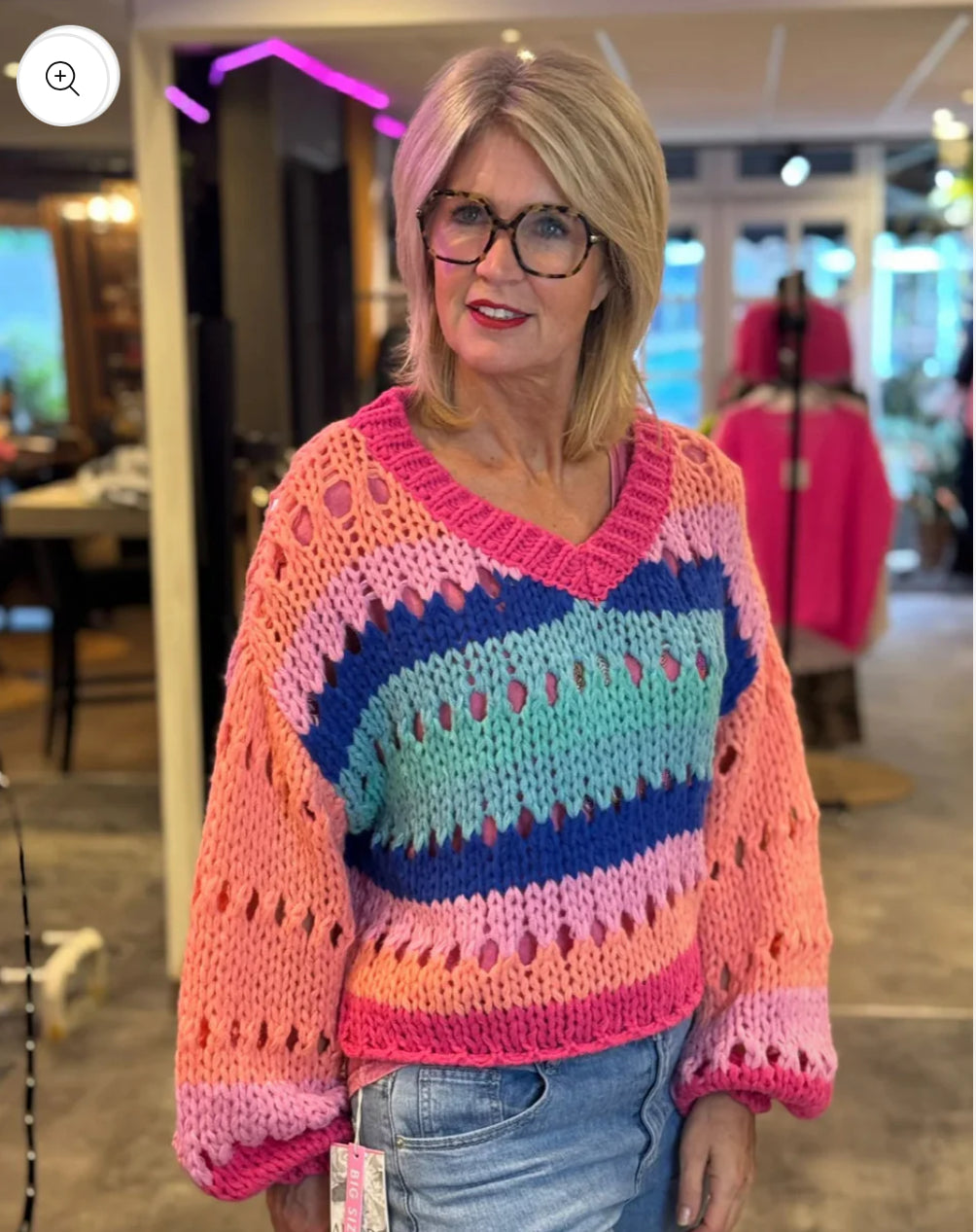 Deze kort gesneden trui is grof gebreid in de mooiste kleuren en voelt heerlijk comfortabel aan.