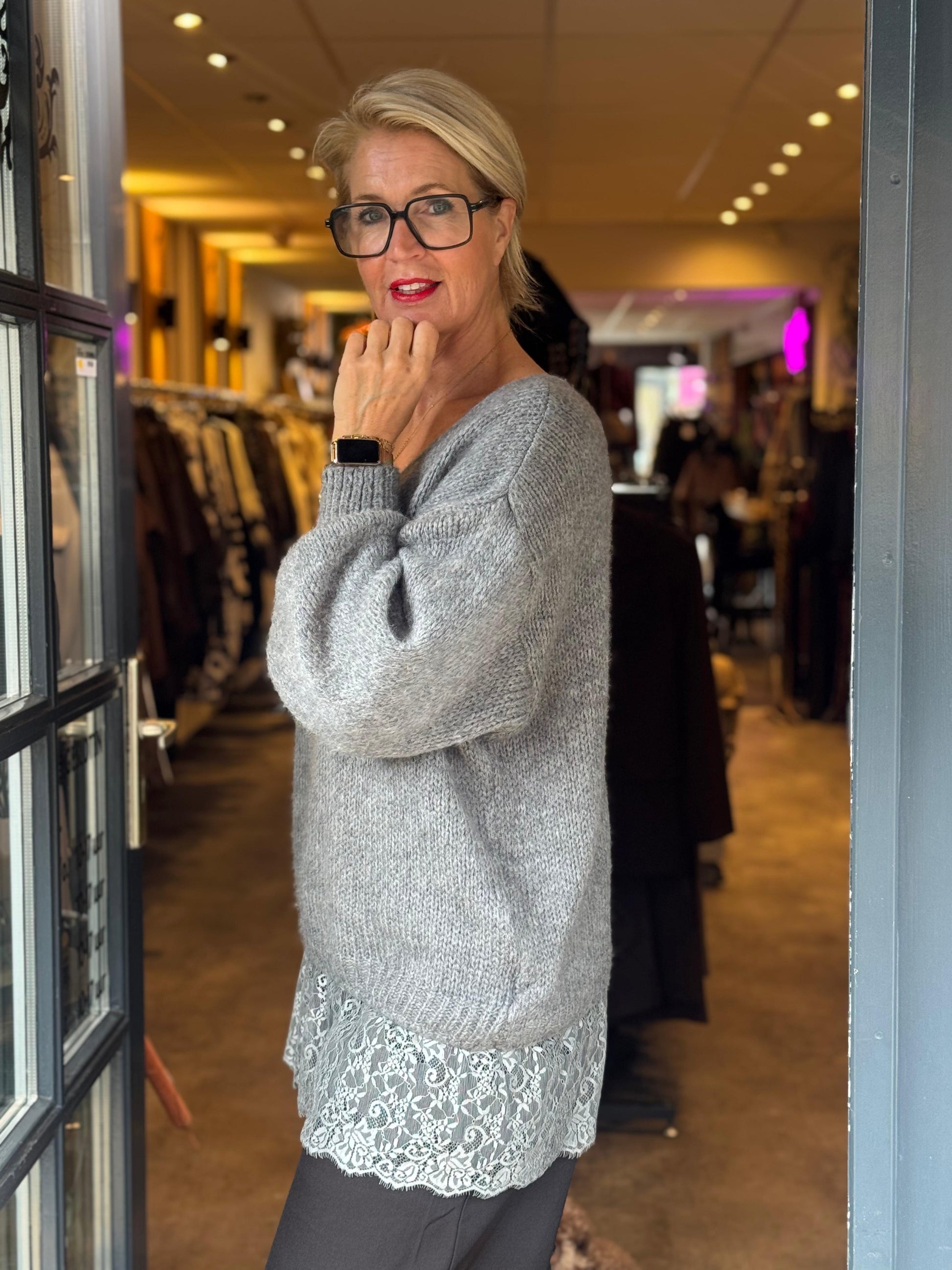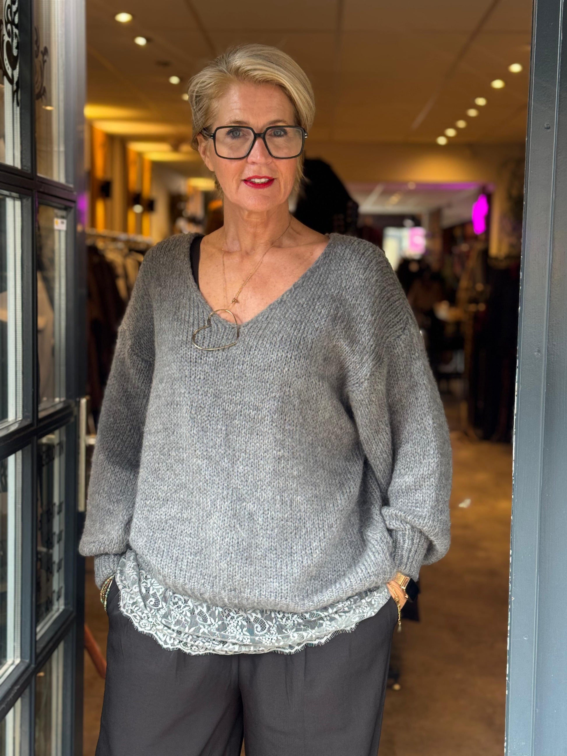 Deze zachte V-hals trui met verfijnd kanten detail voegt moeiteloos een vleugje elegantie toe aan je dagelijkse look.