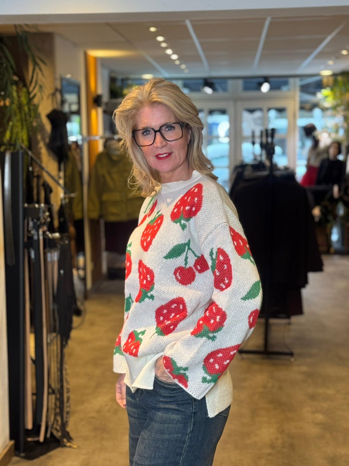 Deze gebreide trui met aardbeienafbeelding combineert comfort met een speelse look.